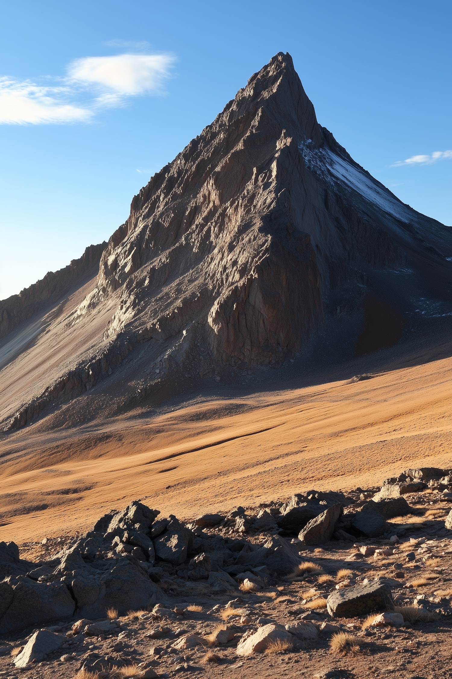 Majestic mountain peak with rugged edges against a clear blue sky, surrounded by rocky terrain and golden hues in the foreground.
