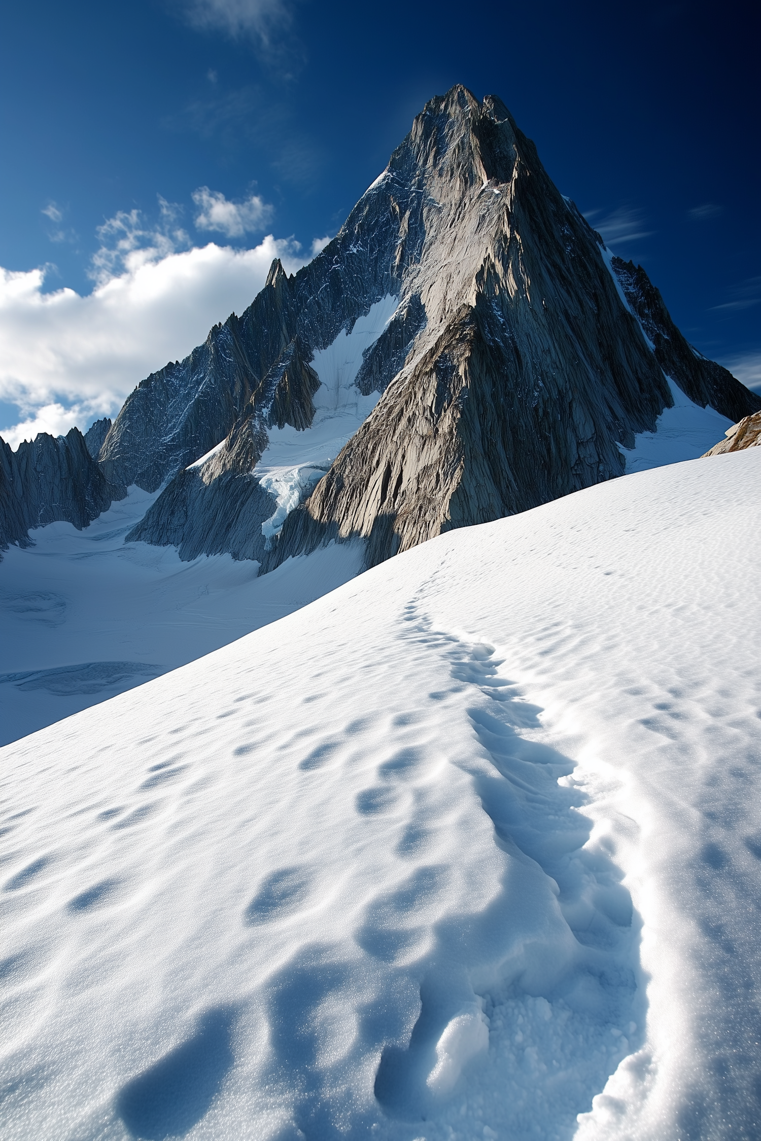 Majestic mountain peak with snow-covered slopes and footprints under a deep blue sky, creating a serene and dramatic landscape.