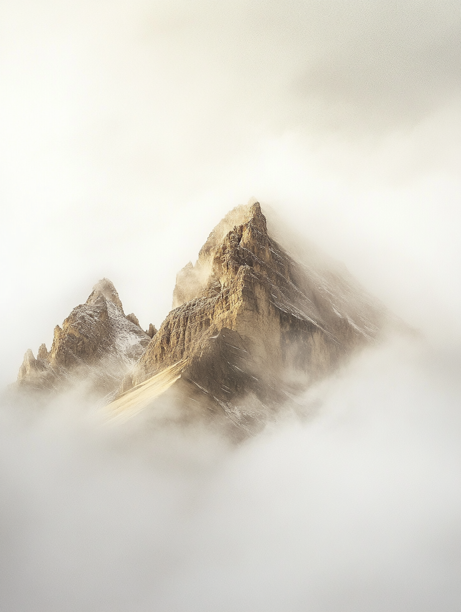 Majestic mountain peak rising through clouds, bathed in golden light, creating a serene and mystical atmosphere.
