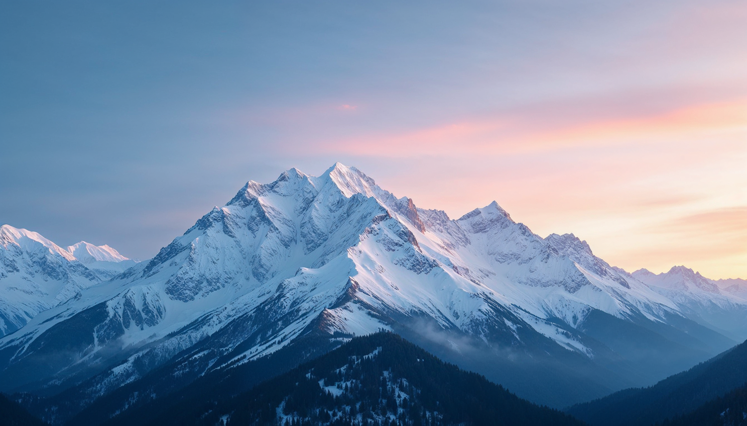 Breathtaking snow-capped mountains at sunrise with pink and orange sky, misty slopes, and forested hills in the foreground.
