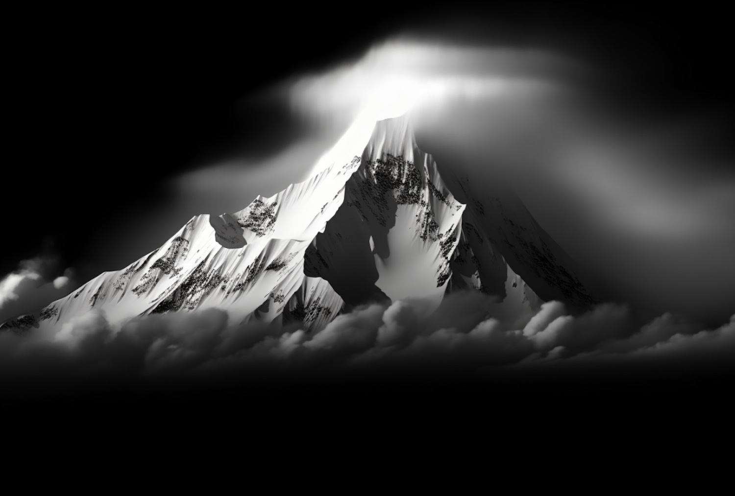 Majestic snow-covered mountain peak with dramatic lighting and clouds, creating a serene and mysterious atmosphere.