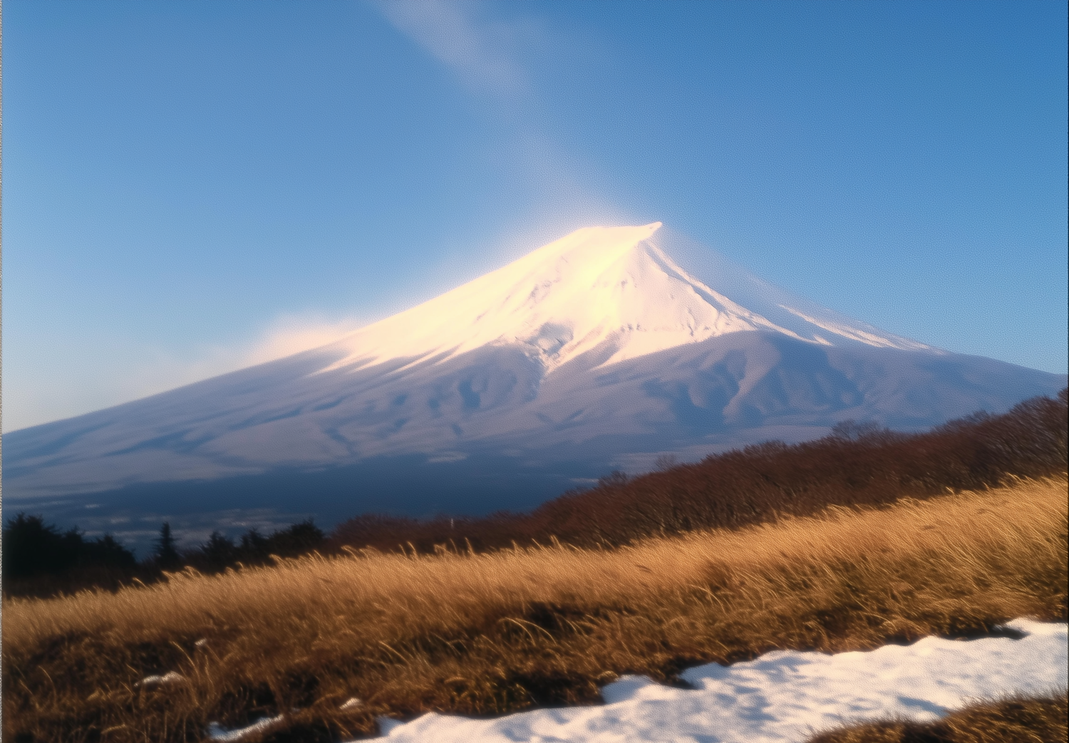 A stunning view of a snow-capped mountain with a golden grass field in the foreground under a clear blue sky.
