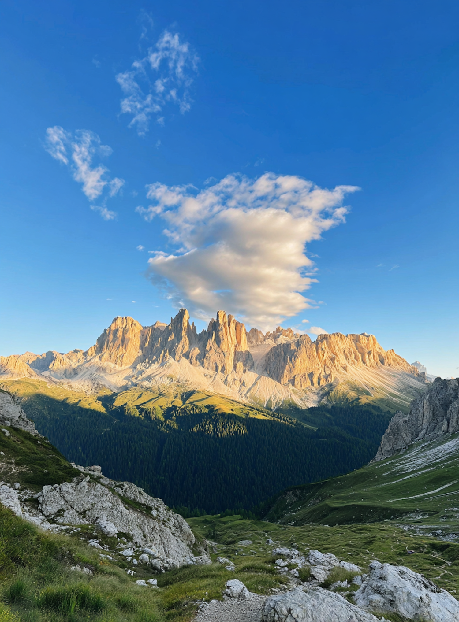 A stunning mountain range under a clear blue sky with scattered clouds, illuminated by warm sunlight, surrounded by lush green valleys.