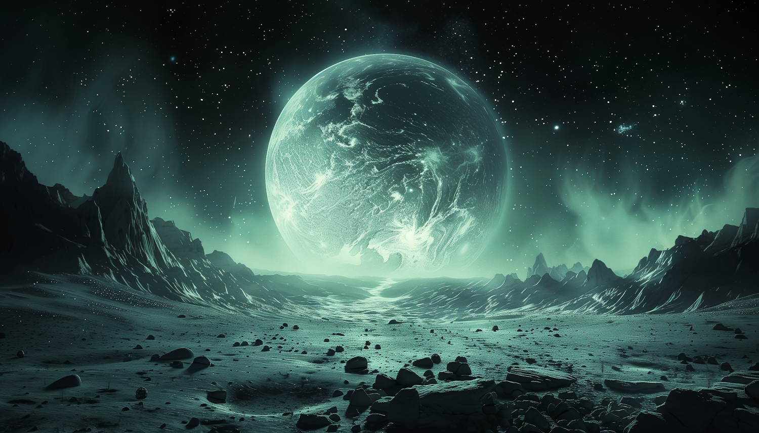 Explore a stunning alien landscape with a glowing planet, jagged mountains, and a starry sky, all bathed in an ethereal green light.