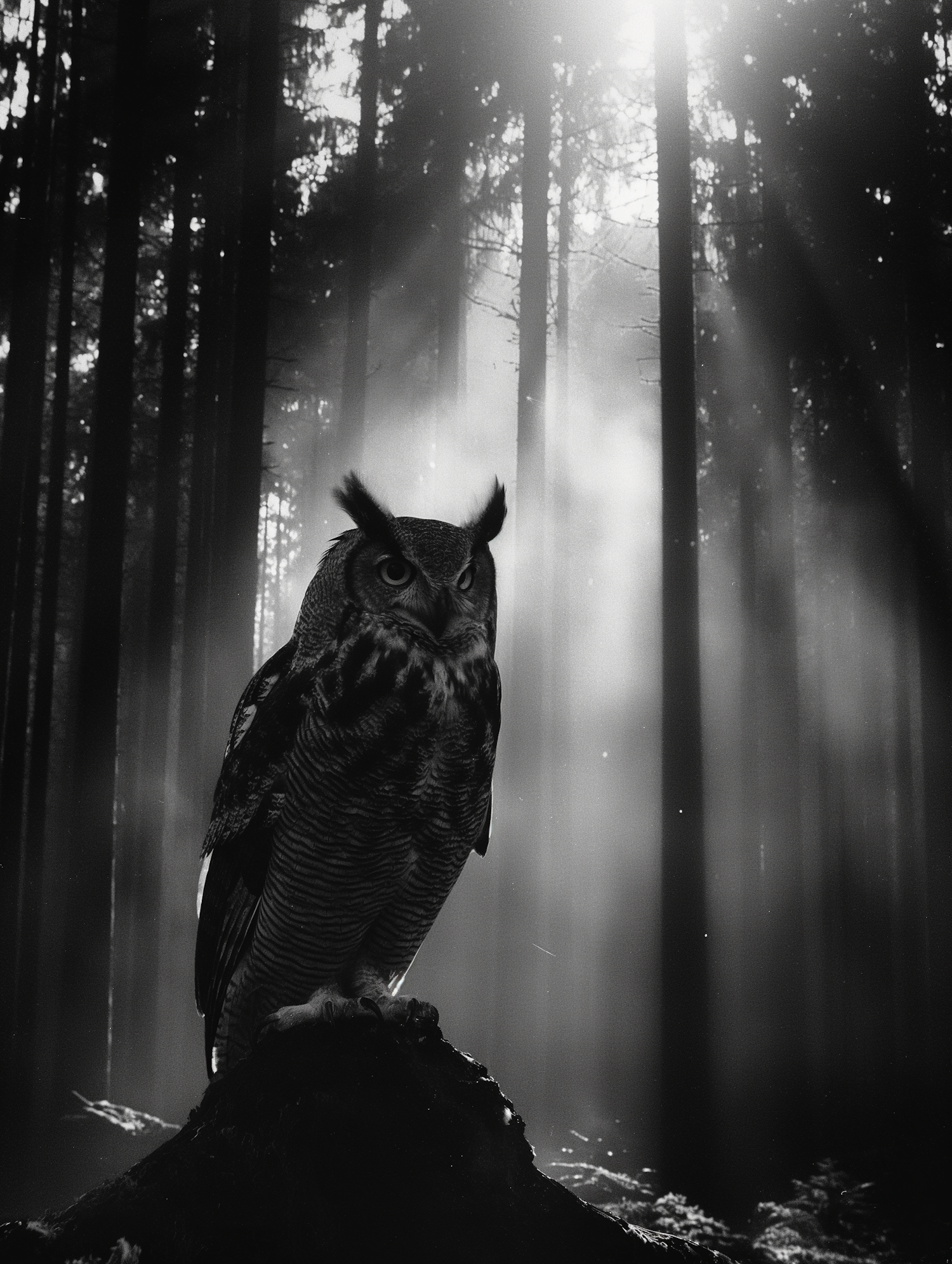 A majestic owl perched in a shadowy forest, illuminated by dramatic light beams, creating a mystical and serene atmosphere.
