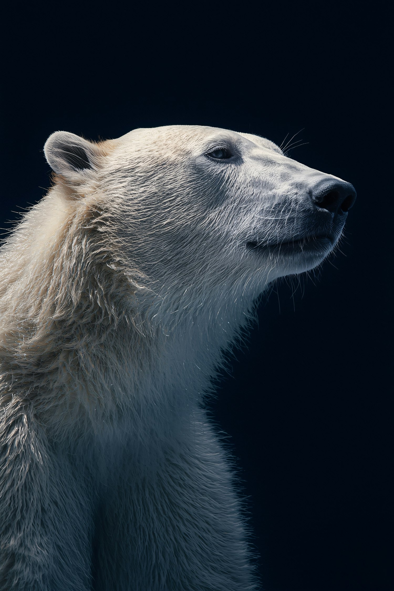 A stunning close-up of a polar bear in profile, its white fur illuminated against a dark background, showcasing its majestic presence.