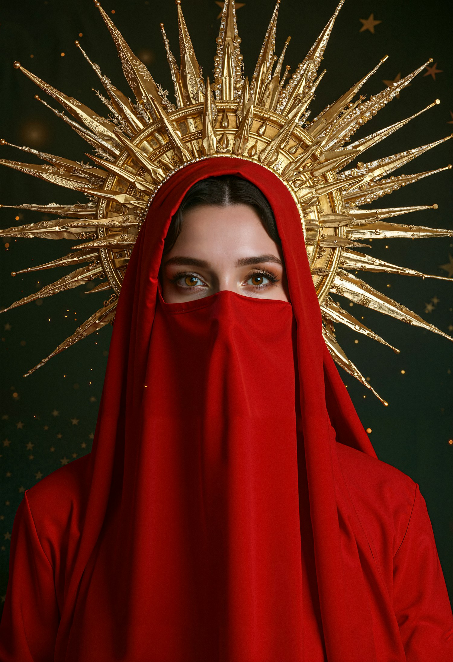 Woman in red veil with golden halo, green eyes, and dark hair against a starry green background, exuding a mystical and regal aura.