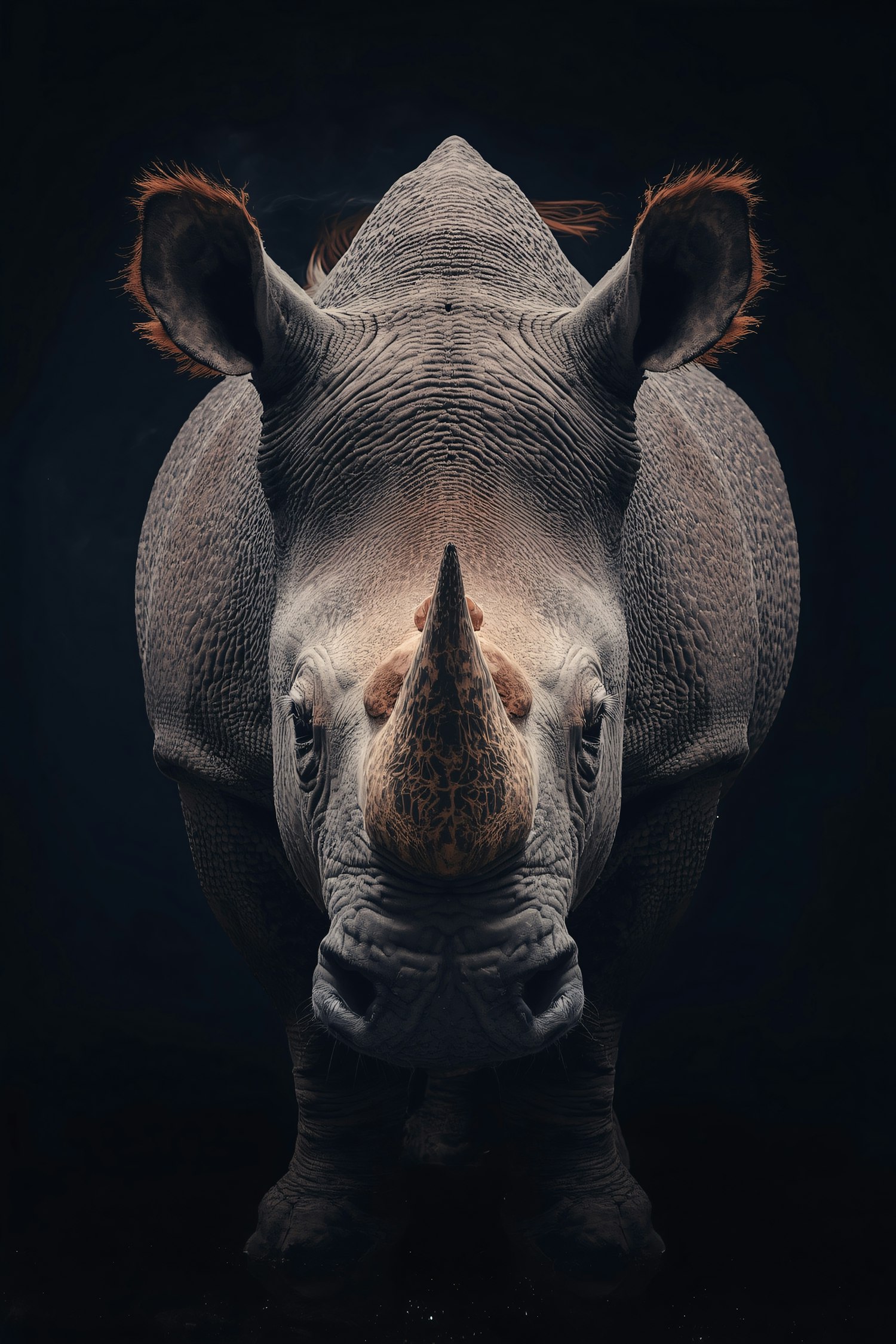 A dramatic close-up of a rhinoceros, showcasing its textured skin and prominent horn against a dark background.