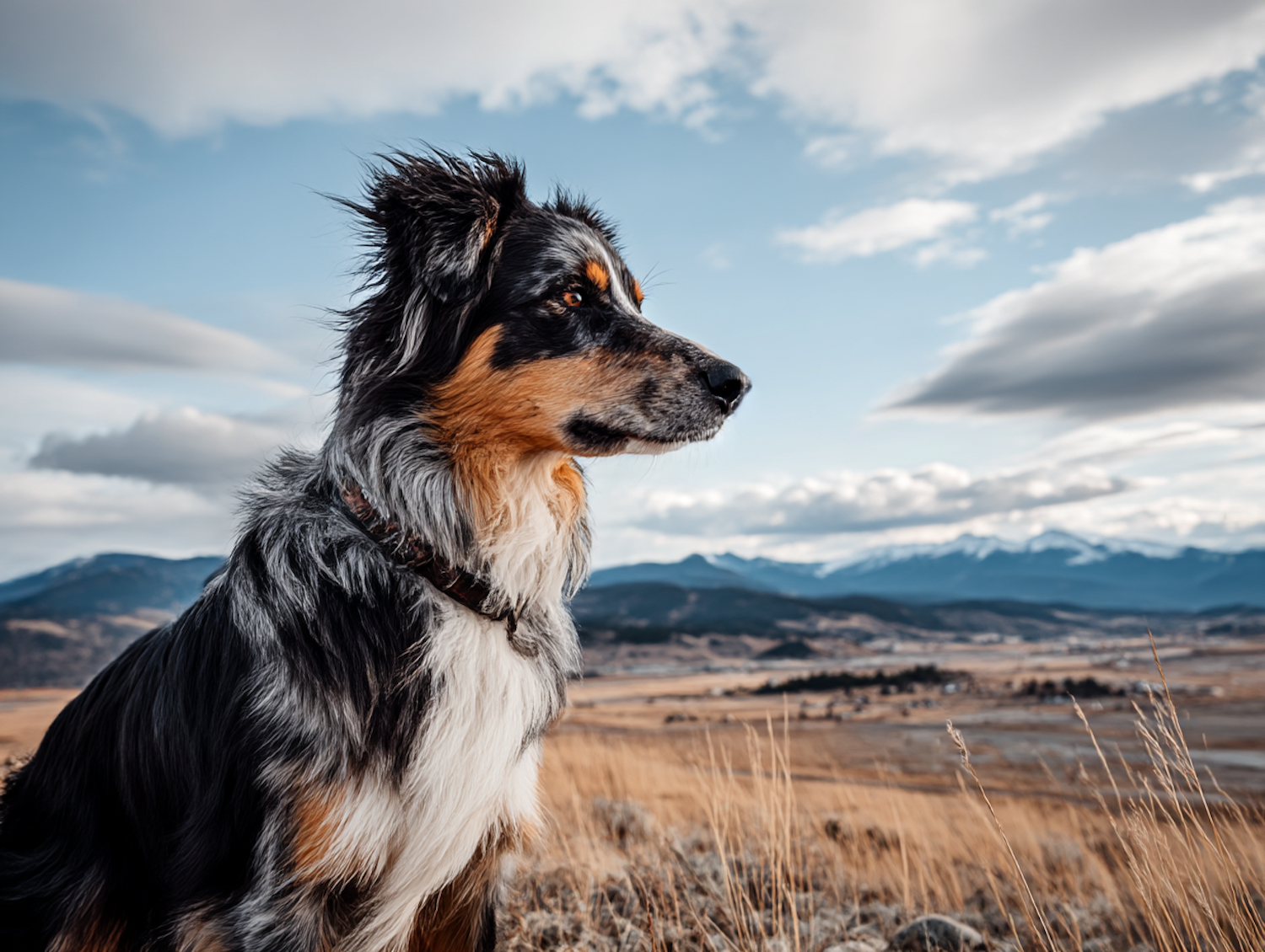 Majestic Australian Shepherd in a golden field with mountains in the background, showcasing its thick, multicolored coat and alert gaze.
