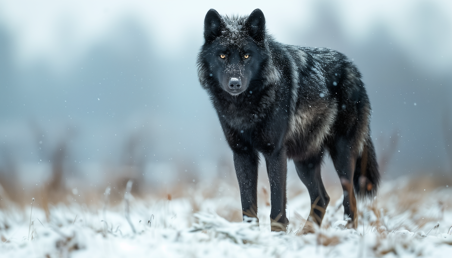 Majestic black wolf in snowy landscape, with piercing yellow eyes and snow-dusted fur, exuding strength and wilderness.