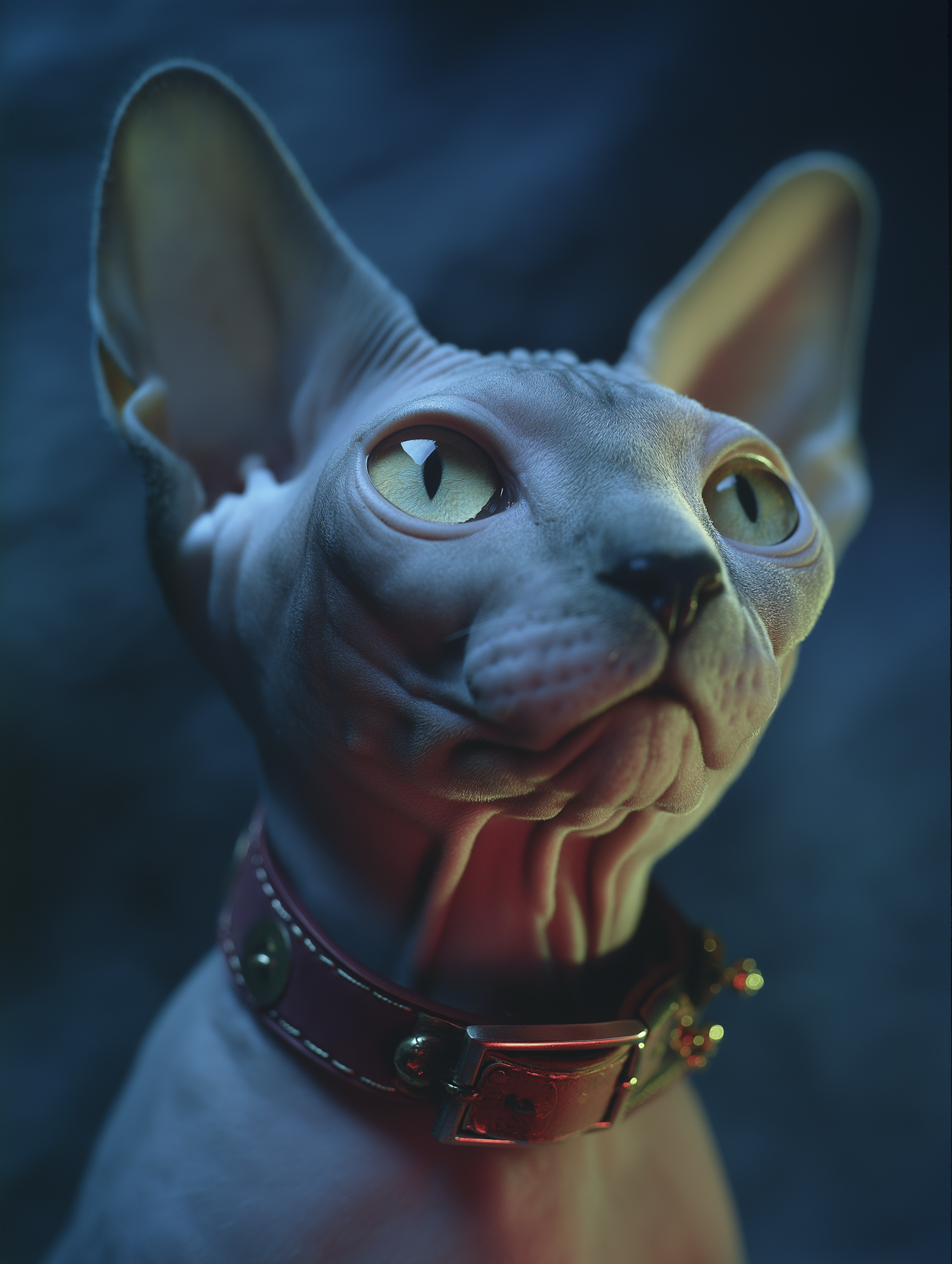 Portrait of a grey sphynx cat wearing a red collar in dramatic lighting, emphasizing its unique features and striking green eyes.
