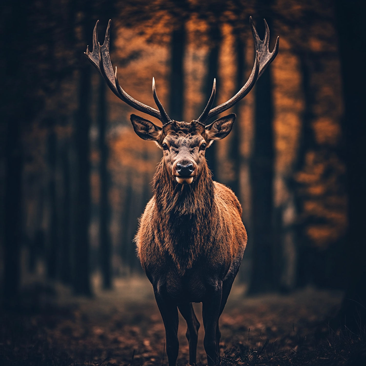 Majestic stag with large antlers in an autumn forest, surrounded by tall trees and warm, earthy colors.