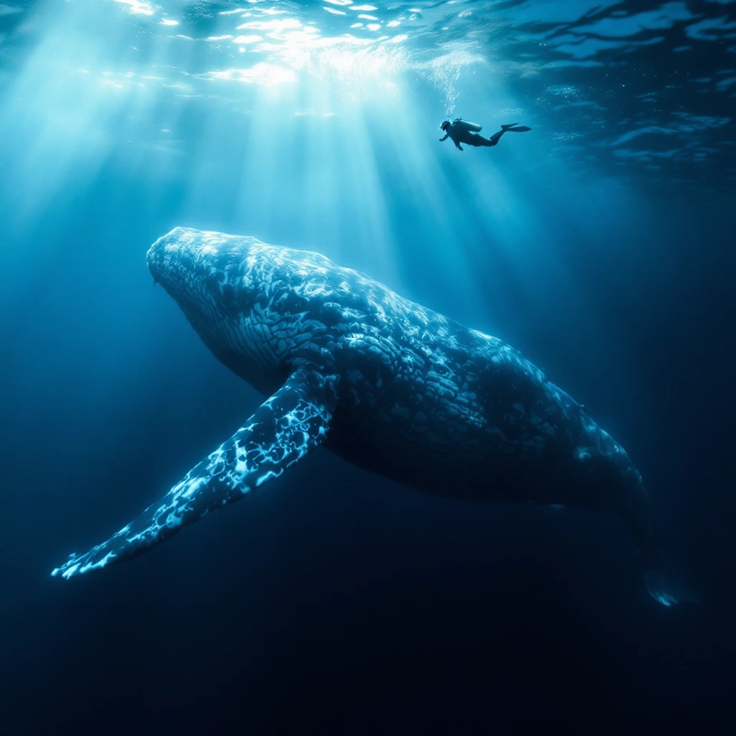 Diver swims alongside a majestic whale in deep blue ocean, illuminated by ethereal sunlight beams. Awe-inspiring underwater scene.