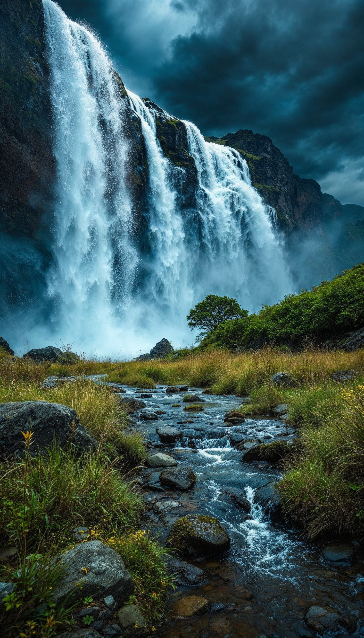 Majestic waterfall cascading down a rocky cliff with a serene stream and lush greenery under dramatic stormy skies.