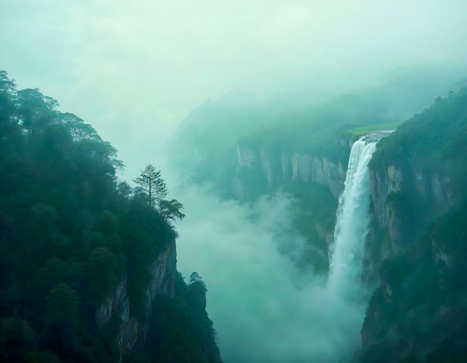 Majestic waterfall amidst lush green forests and misty cliffs, creating a serene and mystical landscape.