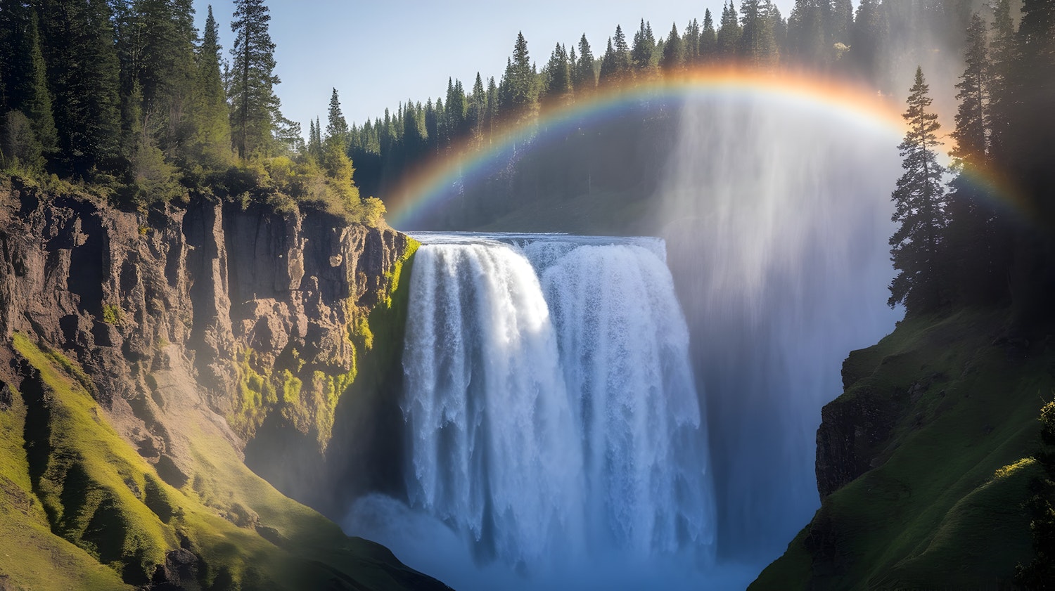 A stunning waterfall with a vibrant rainbow arching over it, surrounded by lush greenery and tall pine trees in a serene forest setting.