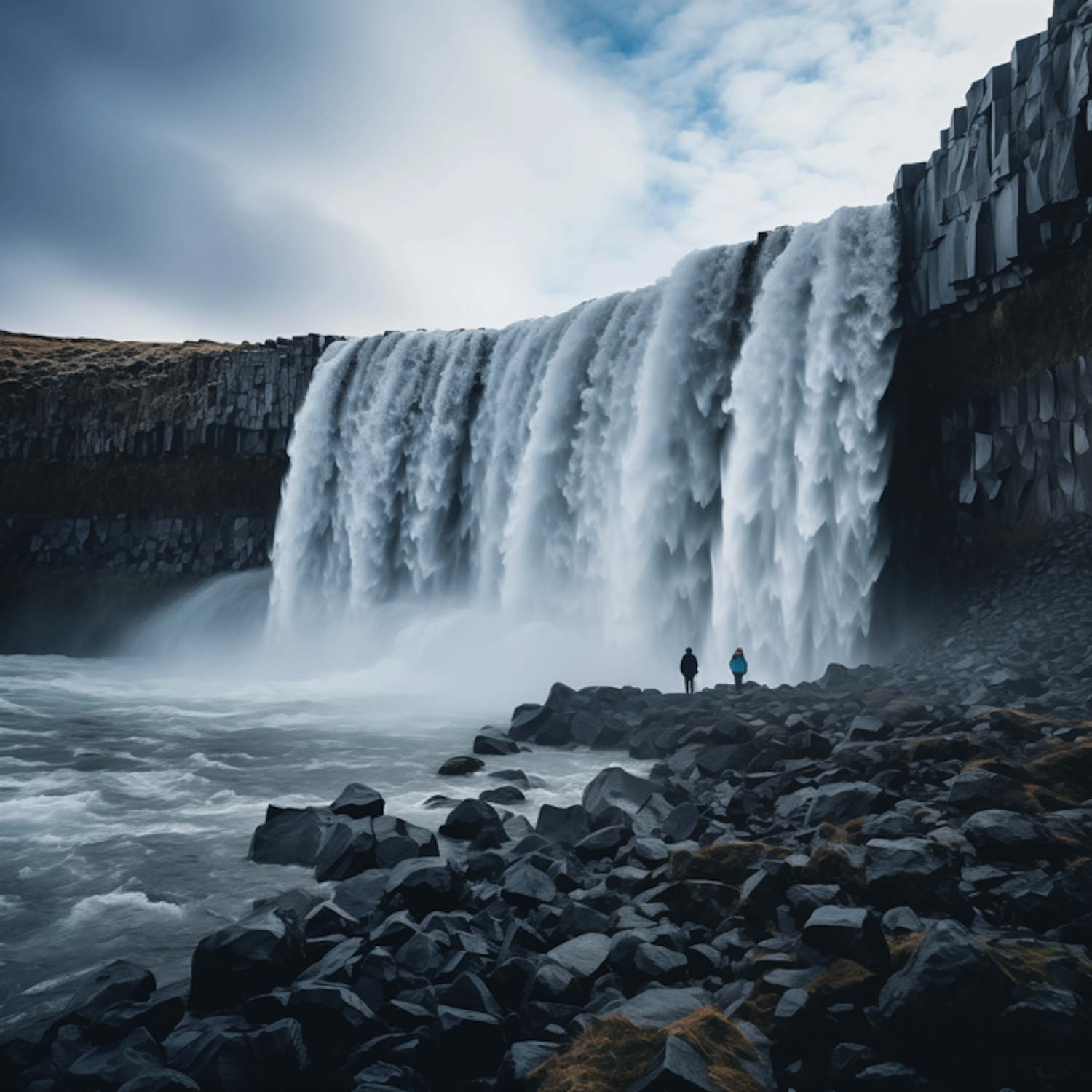 Majestic waterfall over basalt cliffs with two figures below, emphasizing scale and nature's power. Dramatic sky and rocky riverbed.