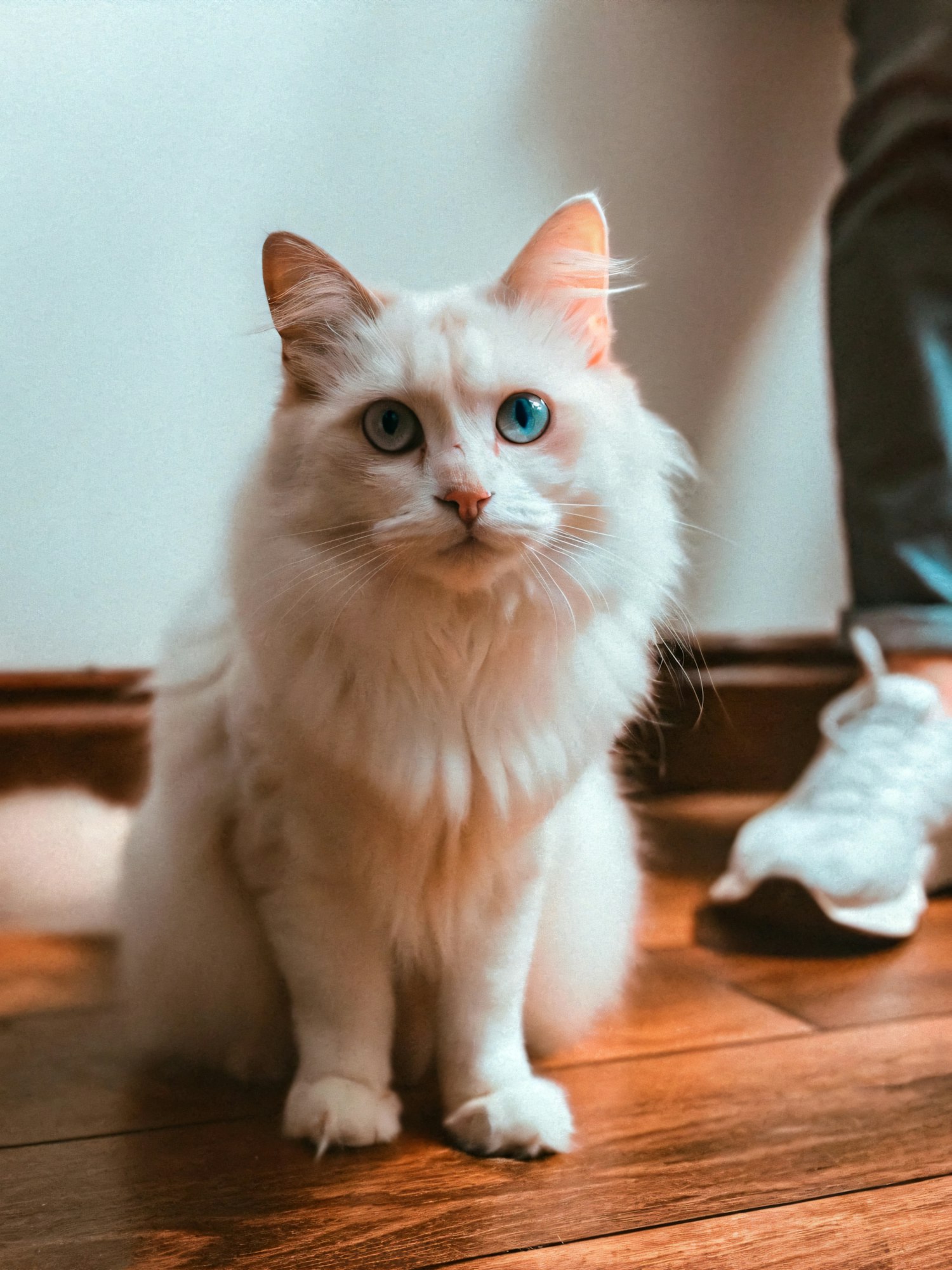 Fluffy white cat with blue eyes sitting on a wooden floor, warm lighting, and a sneaker in the background.