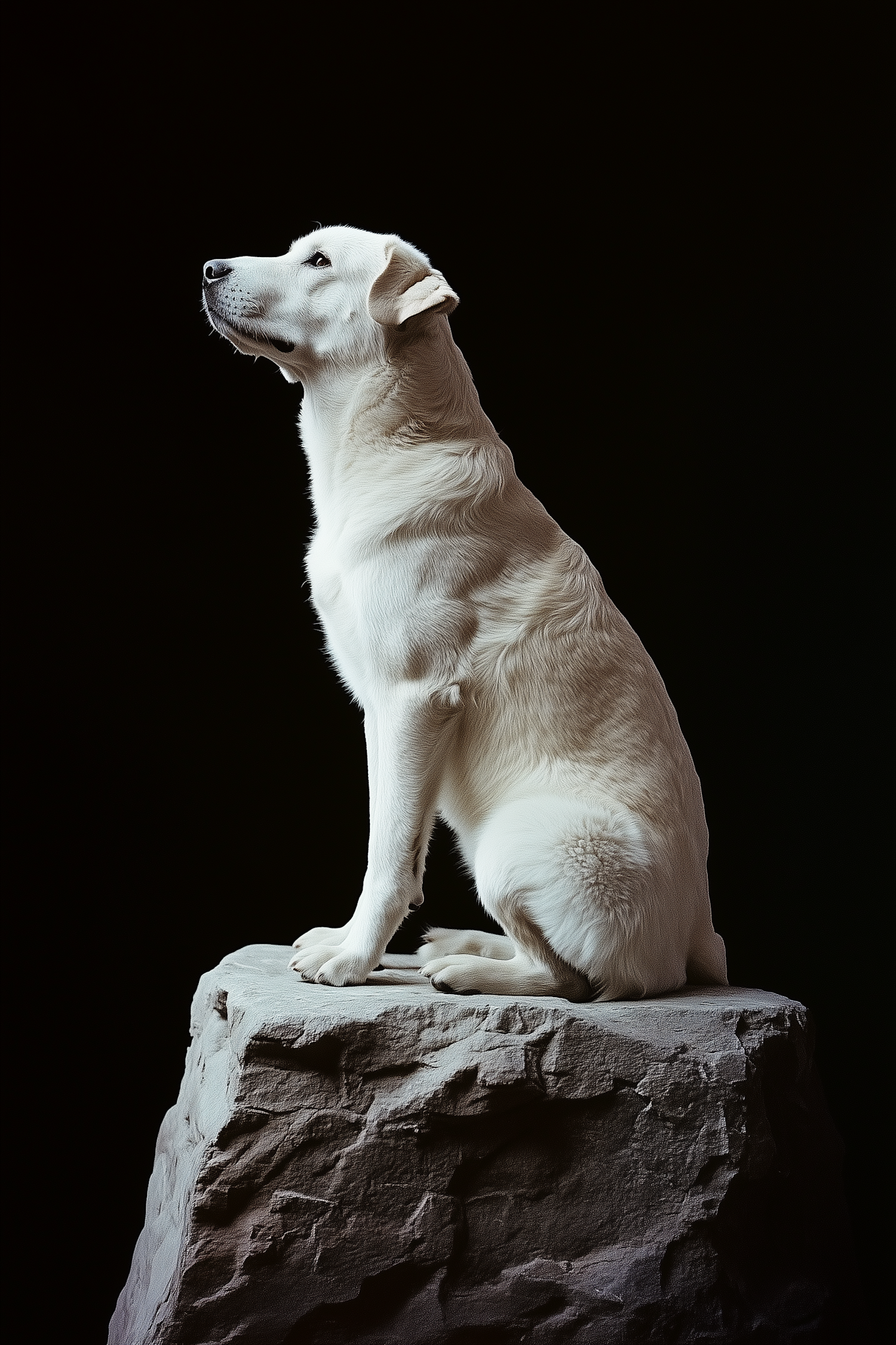 Majestic white dog sitting on a stone pedestal against a black background, exuding elegance and calm in a striking monochrome composition.
