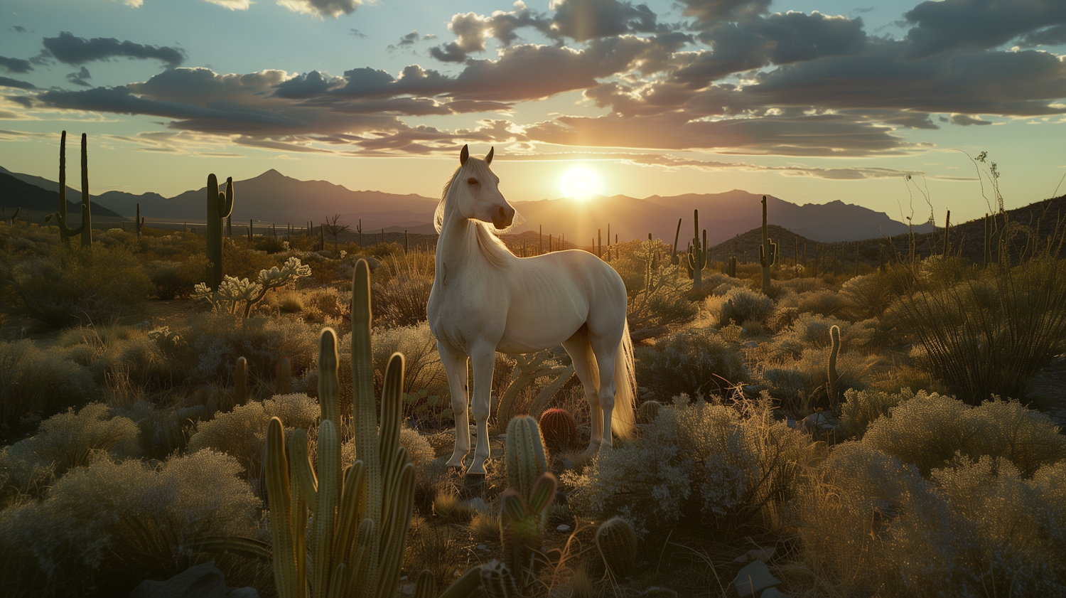 Majestic white horse in a desert sunset, surrounded by cacti and mountains. Warm golden light and scattered clouds create a serene atmosphere.