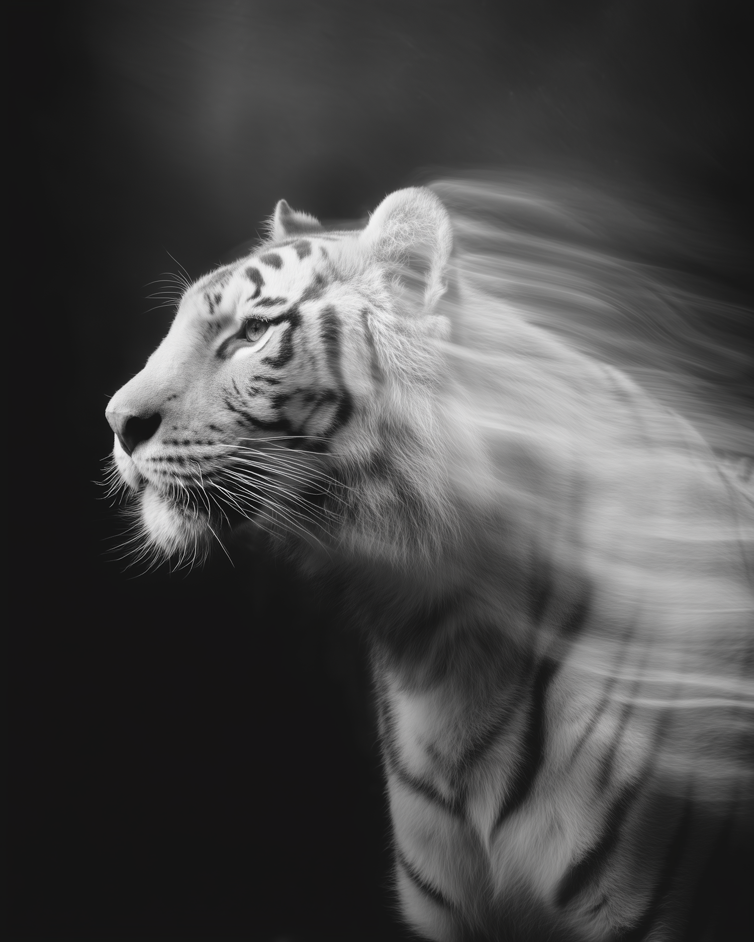 Majestic white tiger in profile with motion blur, set against a dark background. A stunning black-and-white artistic composition.
