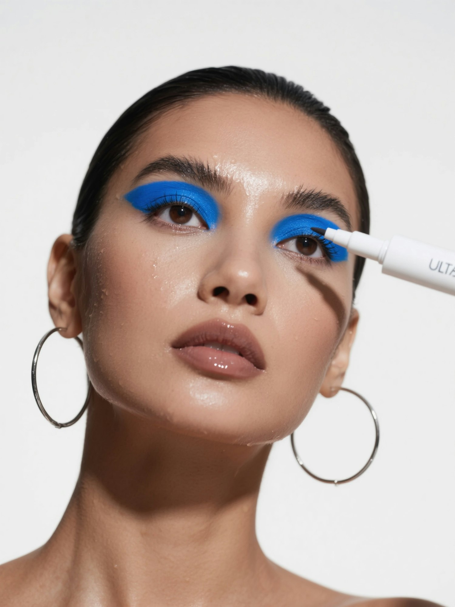 ultra-realistic beauty editorial photo, high contrast studio lighting, clean white background, glossy skin with visible texture, bold makeup, confident attitude, close-up or mid-shot, unbranded packaging — no logo, no label, no design, completely blank, wet-look aesthetic, luxury minimal style, sharp focus on product and face, woman with tan skin and slicked hair applying vivid electric blue eyeliner with a clean applicator, silver hoops, looking upward with an intense expression