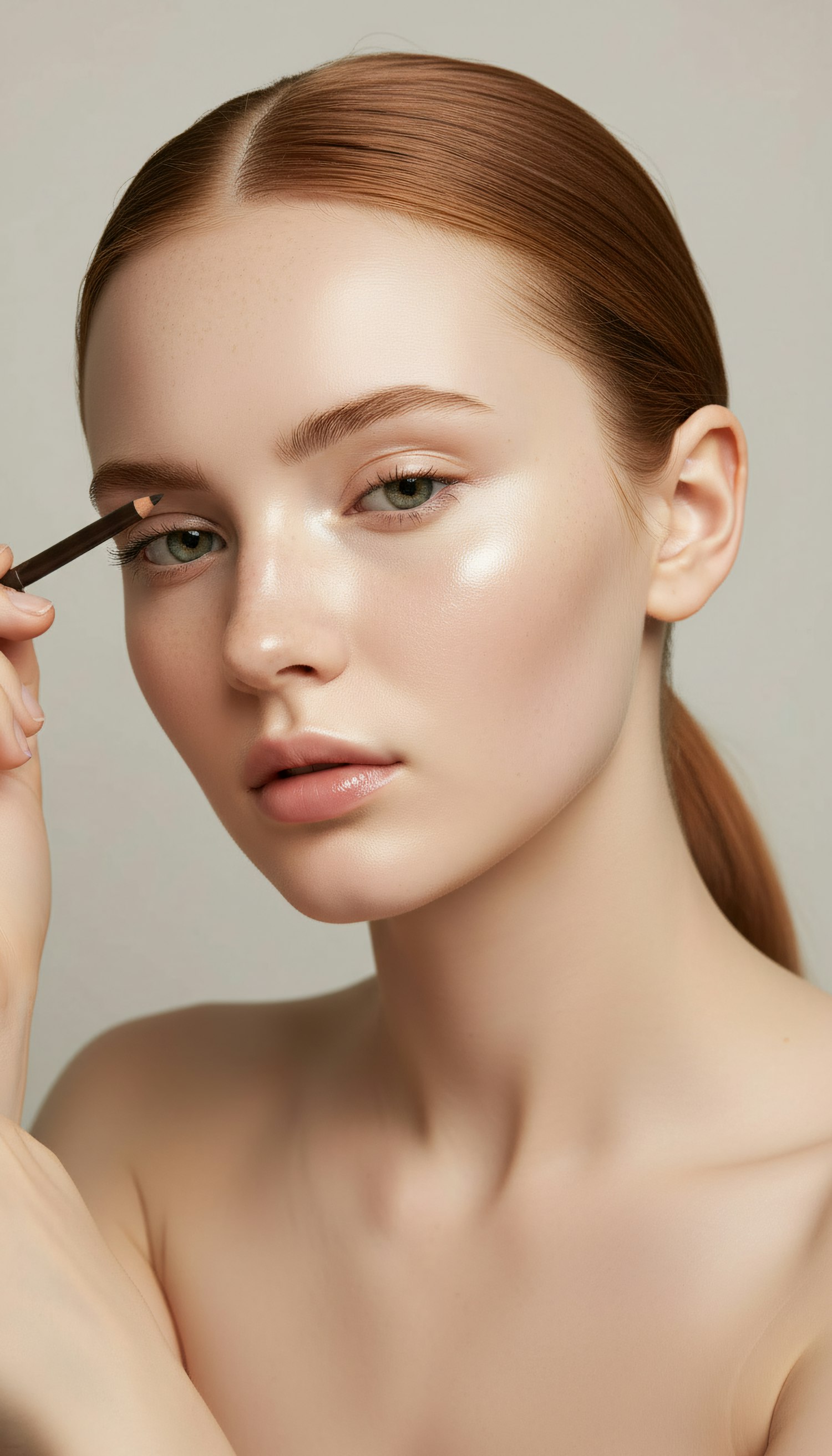 Close-up of a person applying makeup to their eyebrows, showcasing a natural and polished look with a sleek hairstyle and glowing skin.