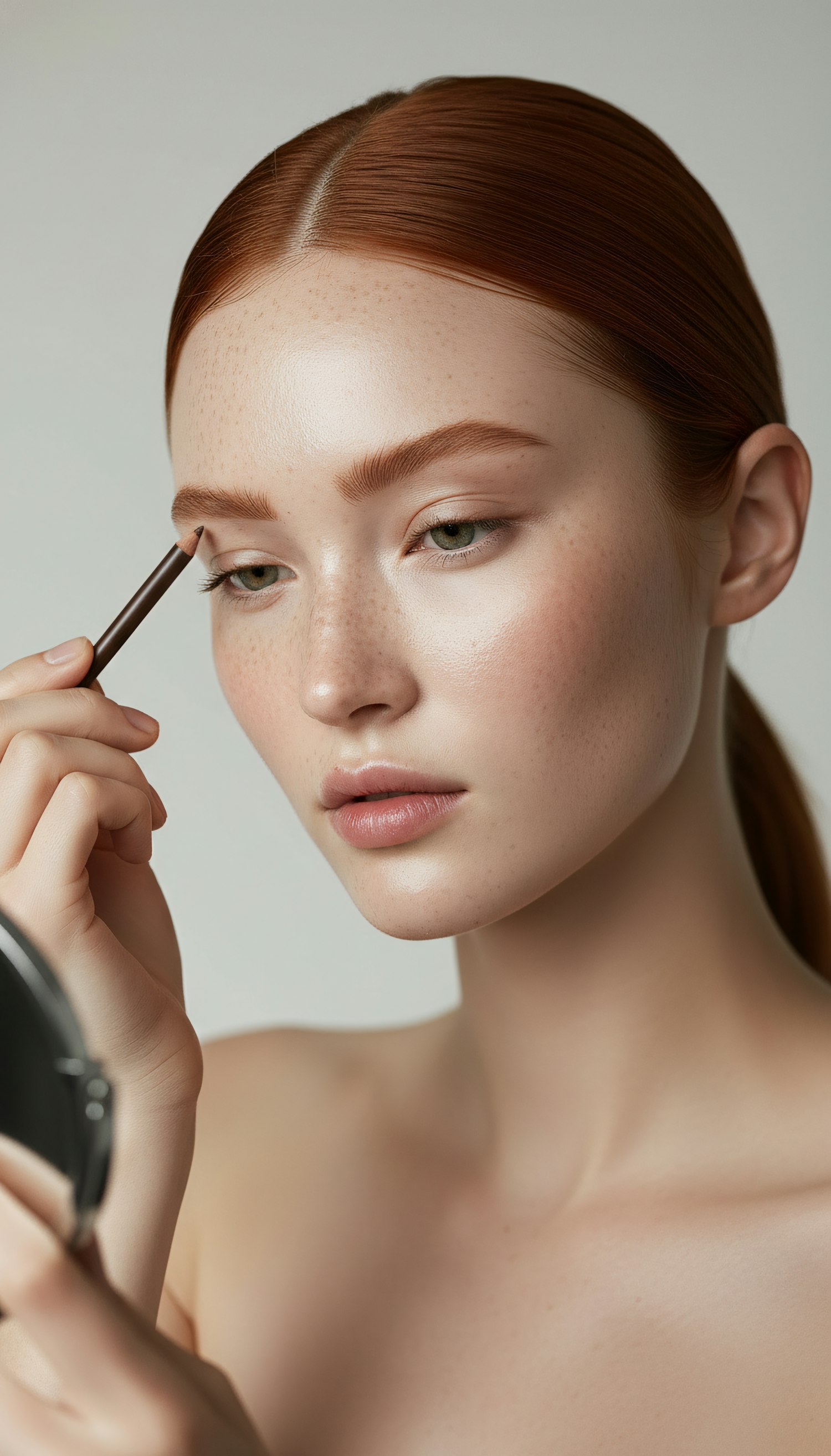 A young woman with red hair applies makeup to her eyebrows, focusing intently while holding a small mirror.