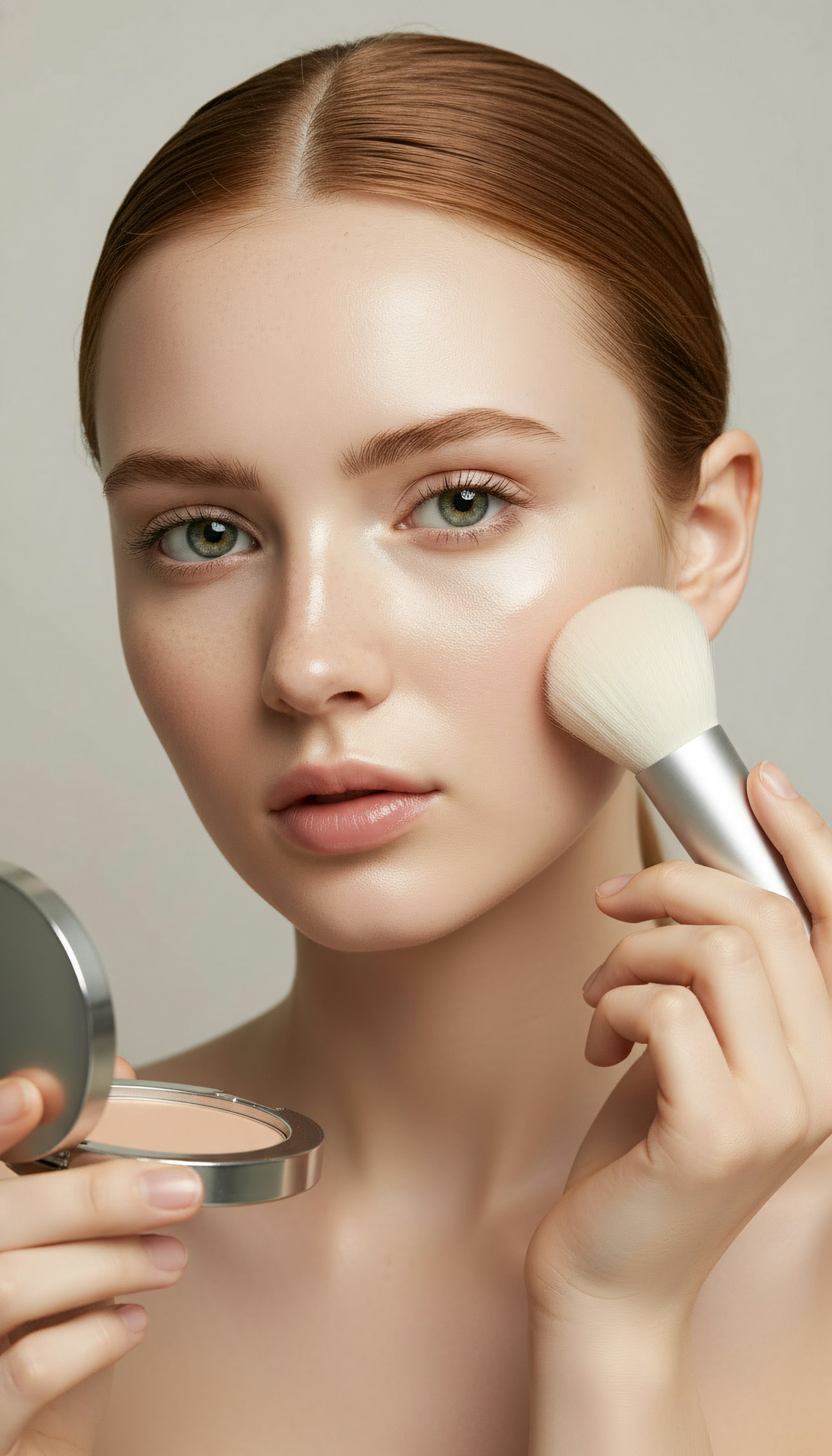 A young woman with fair skin and green eyes applies makeup with a soft brush, holding a compact mirror, in a well-lit, neutral setting.