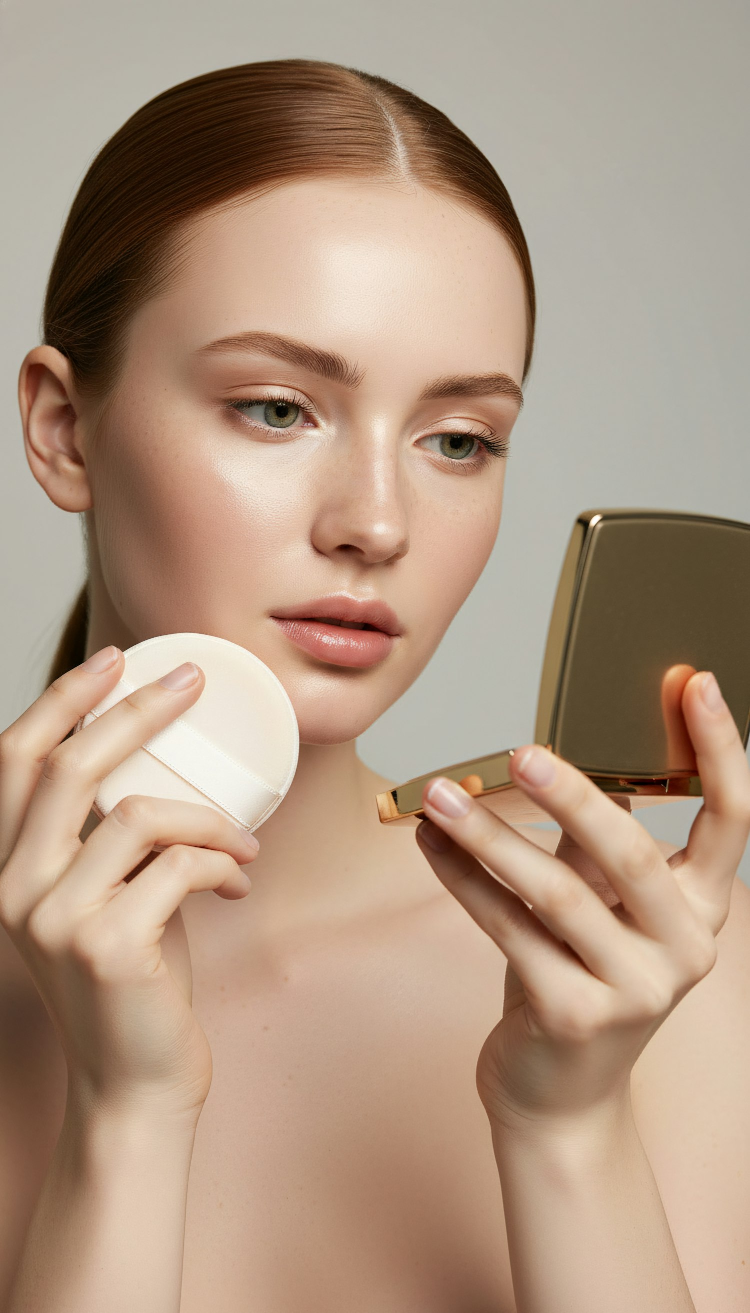 A young woman with fair skin and auburn hair applies makeup using a golden compact mirror and a powder puff, showcasing a serene moment.