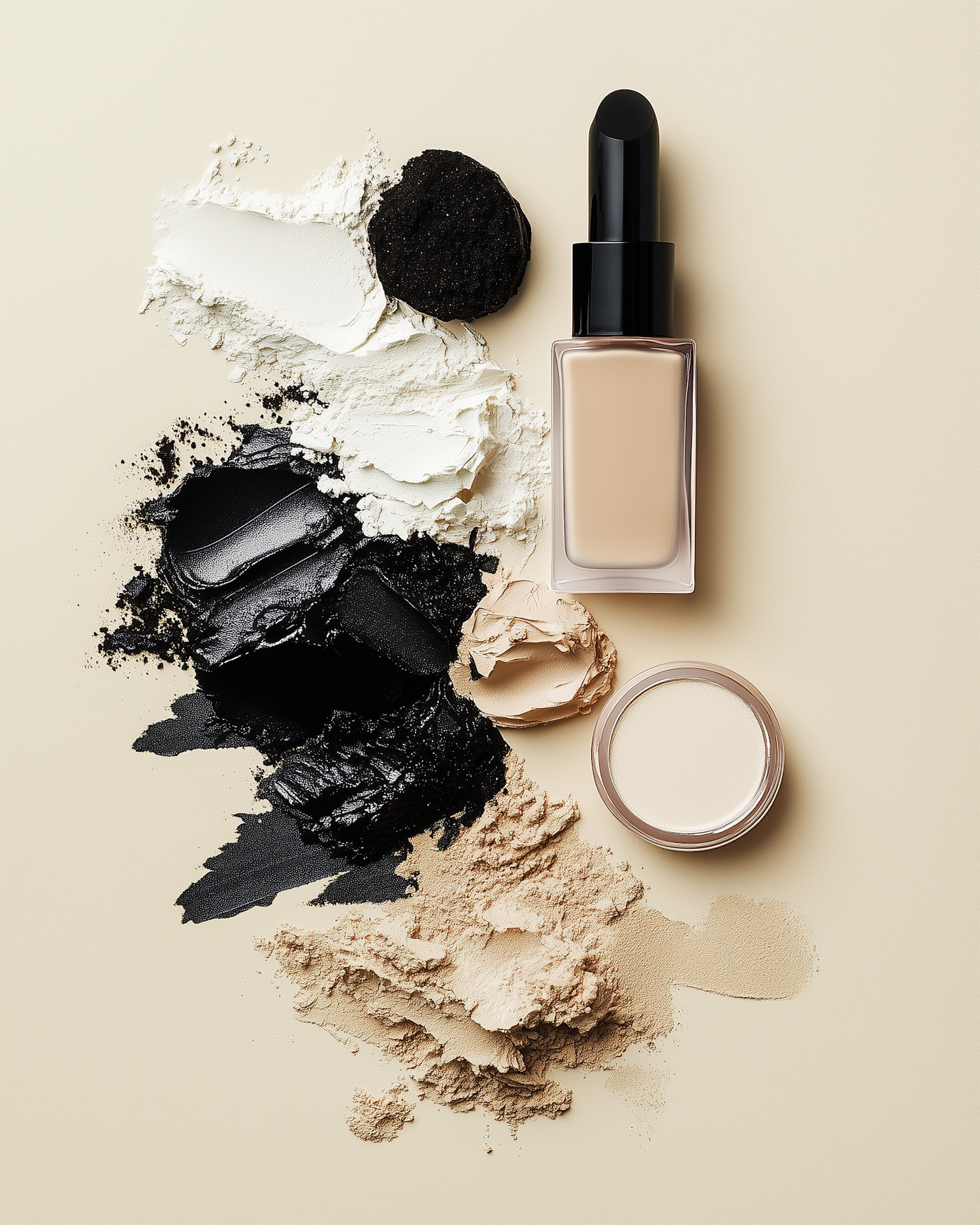 Flat-lay of makeup products with liquid foundation, loose powder, and artistic smears in black, white, and beige tones.