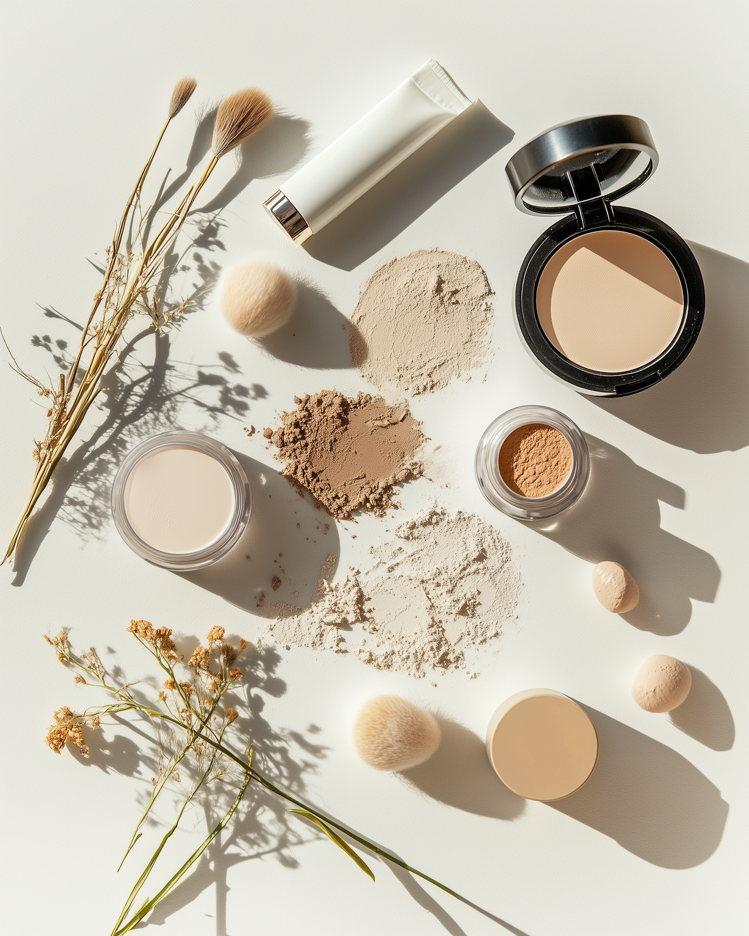 Flat lay of makeup products with powders, brushes, and dried flowers on a light background, creating a natural and elegant aesthetic.