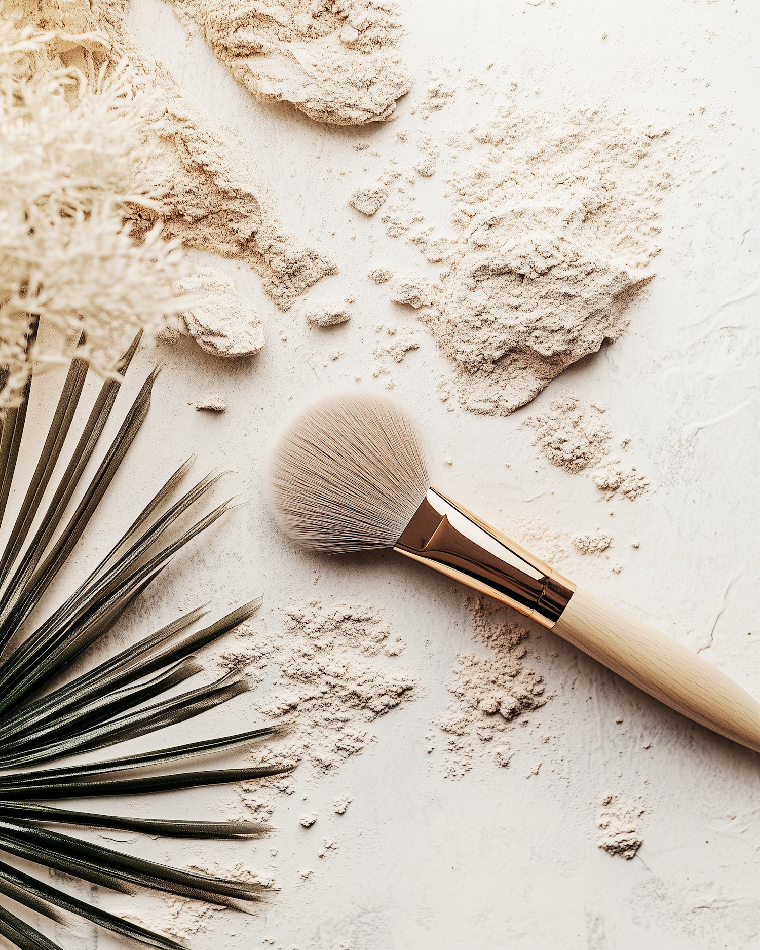 Elegant makeup brush on textured surface with loose powder and palm leaf, creating a serene and natural aesthetic.