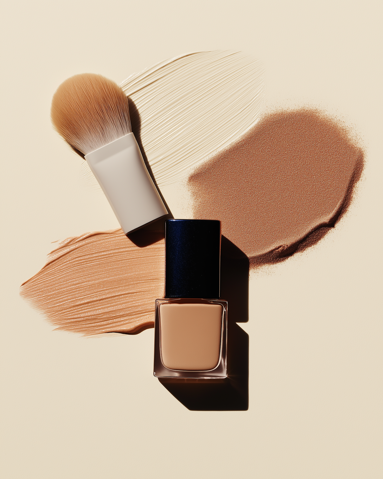 Flat lay of makeup essentials: brush, foundation, and powder on a beige background, showcasing textures and colors.