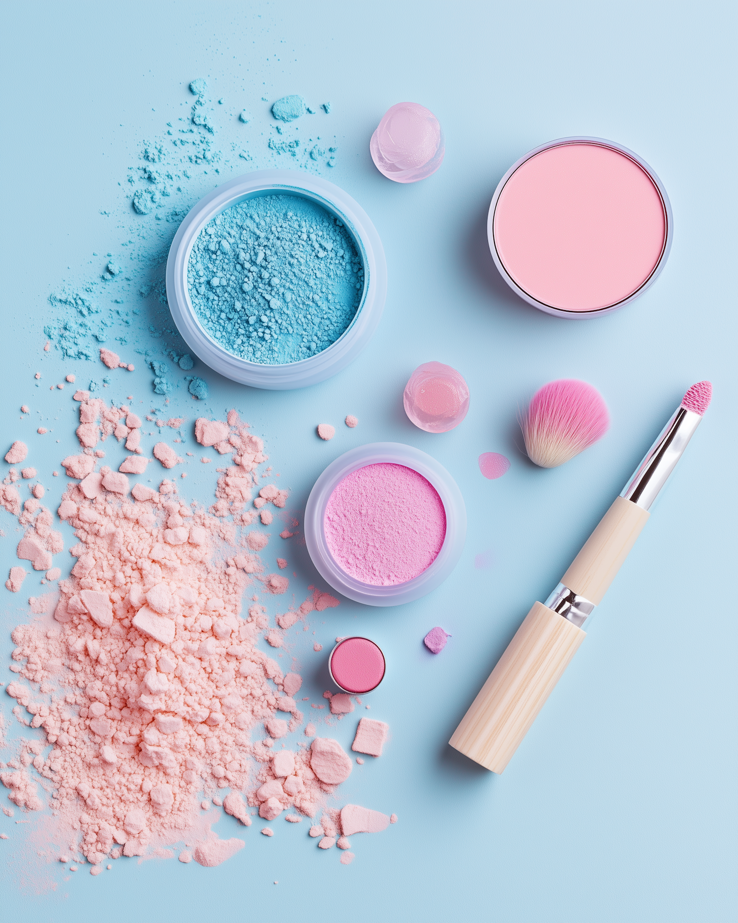 Pastel makeup flat lay with blue and pink powders, blush, and brush on a light blue background. Elegant and harmonious composition.