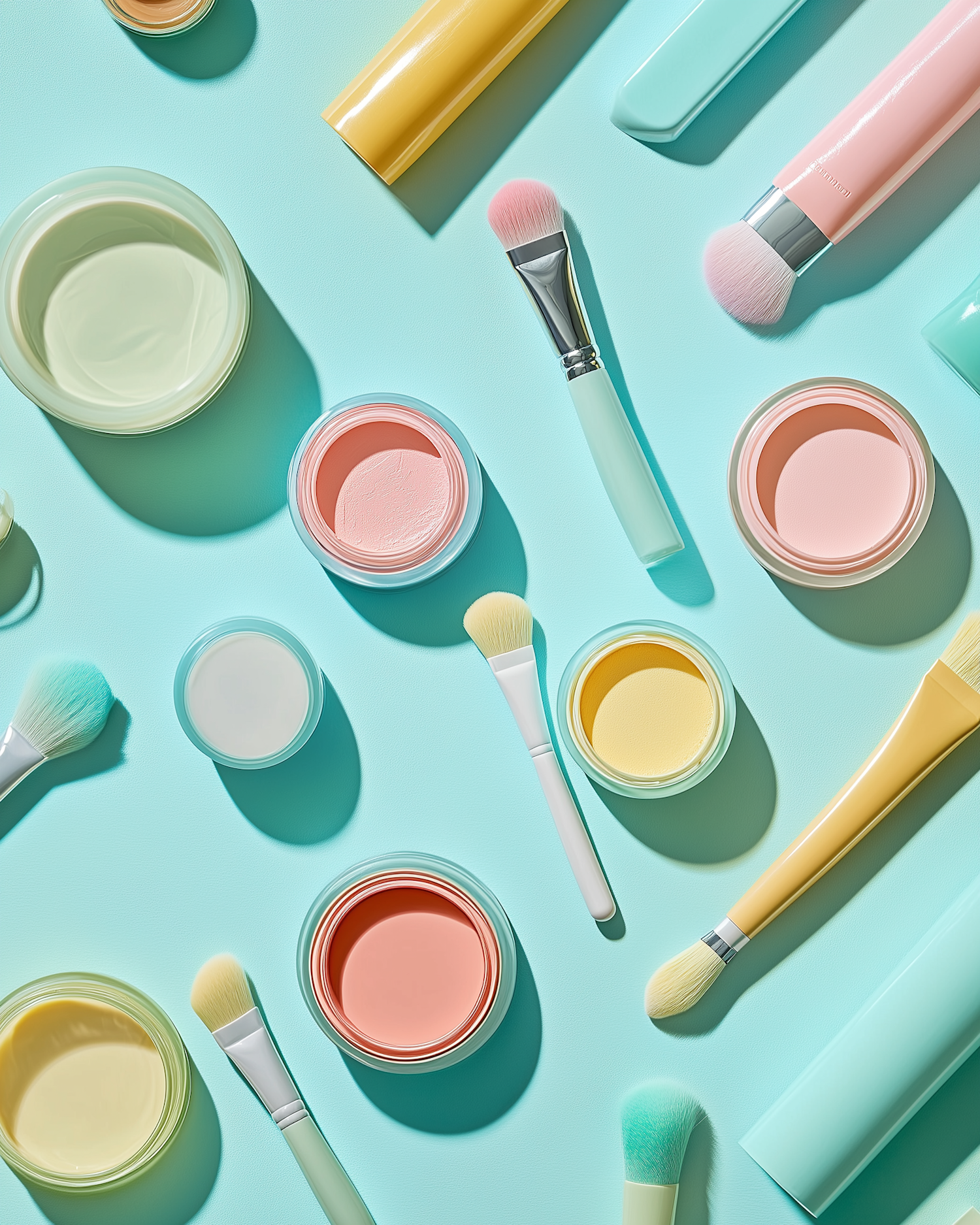 Colorful makeup products and brushes on a pastel turquoise background, featuring pastel shades and sleek design.