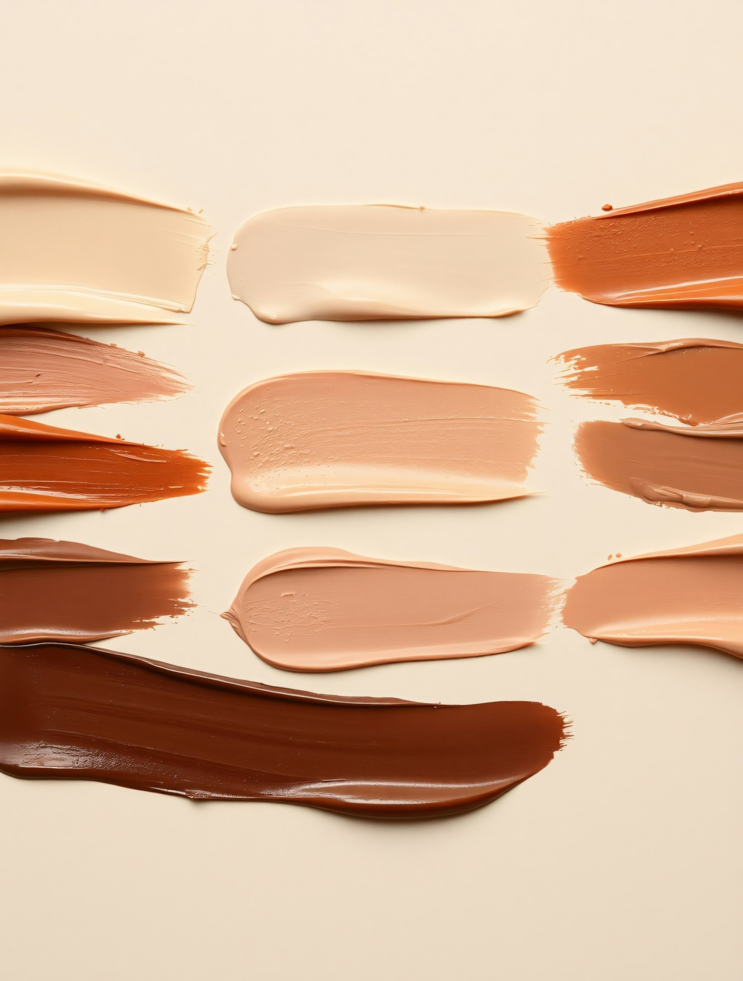 Diverse makeup foundation swatches on a beige background, showcasing a range of skin tones from light to dark.