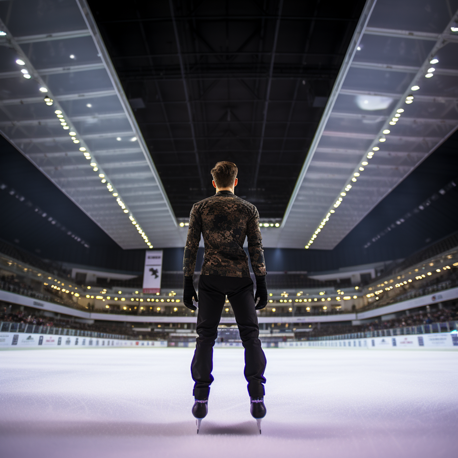 A figure skater stands confidently on a brightly lit ice rink, ready to perform, with spectators watching from the stands.