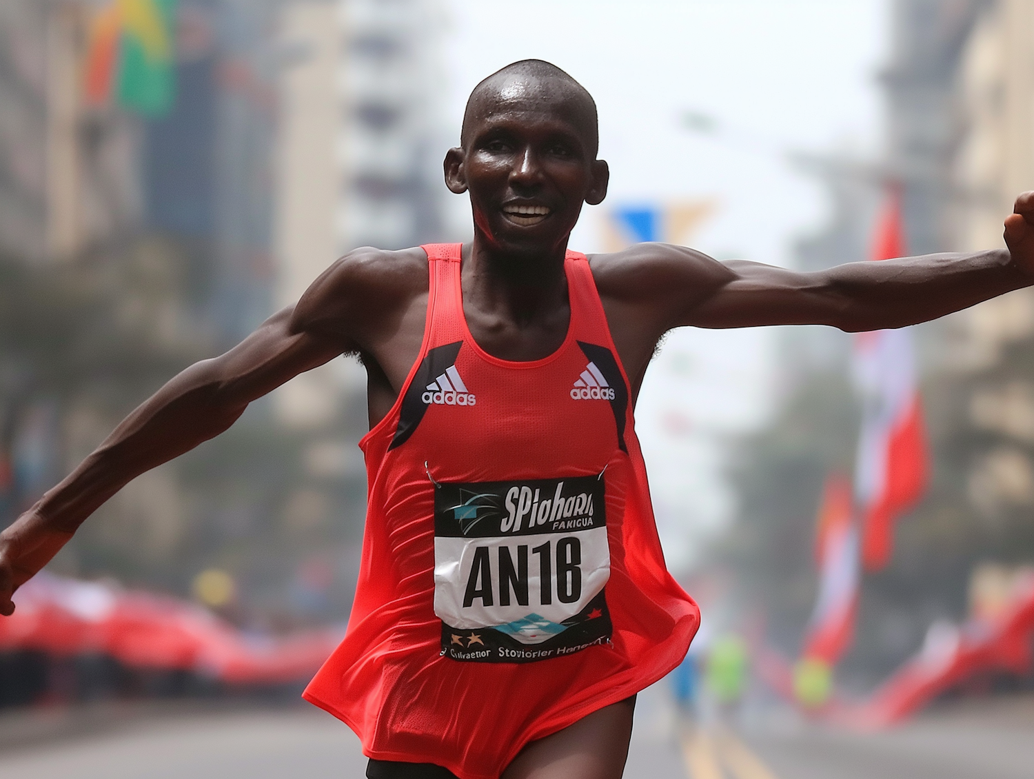 Triumphant athlete in red Adidas gear celebrates at a marathon finish line, arms outstretched in victory.