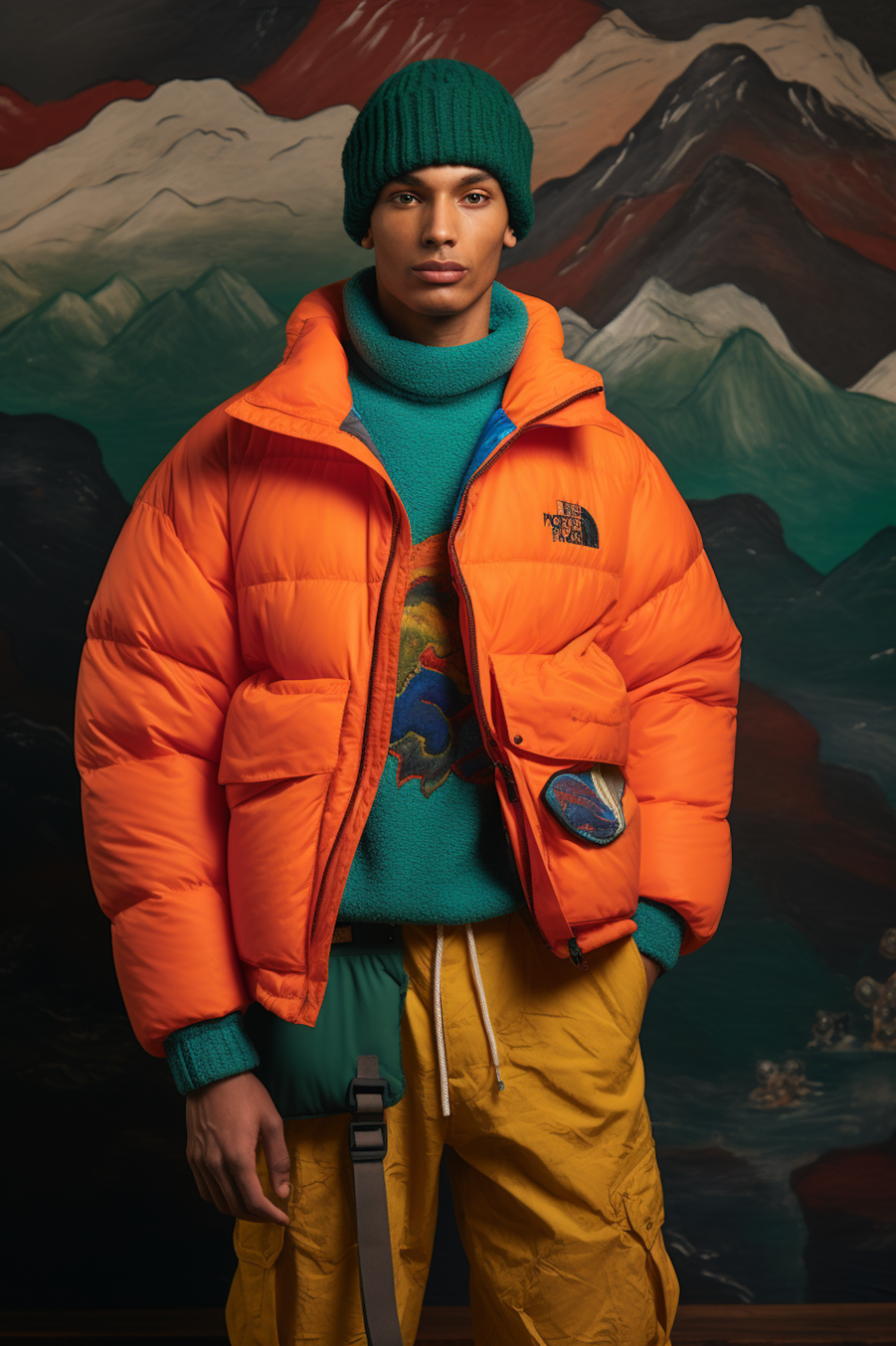 Young man in vibrant orange puffer jacket and teal sweater, set against a stylized mountain backdrop. Fashion-forward and adventurous.