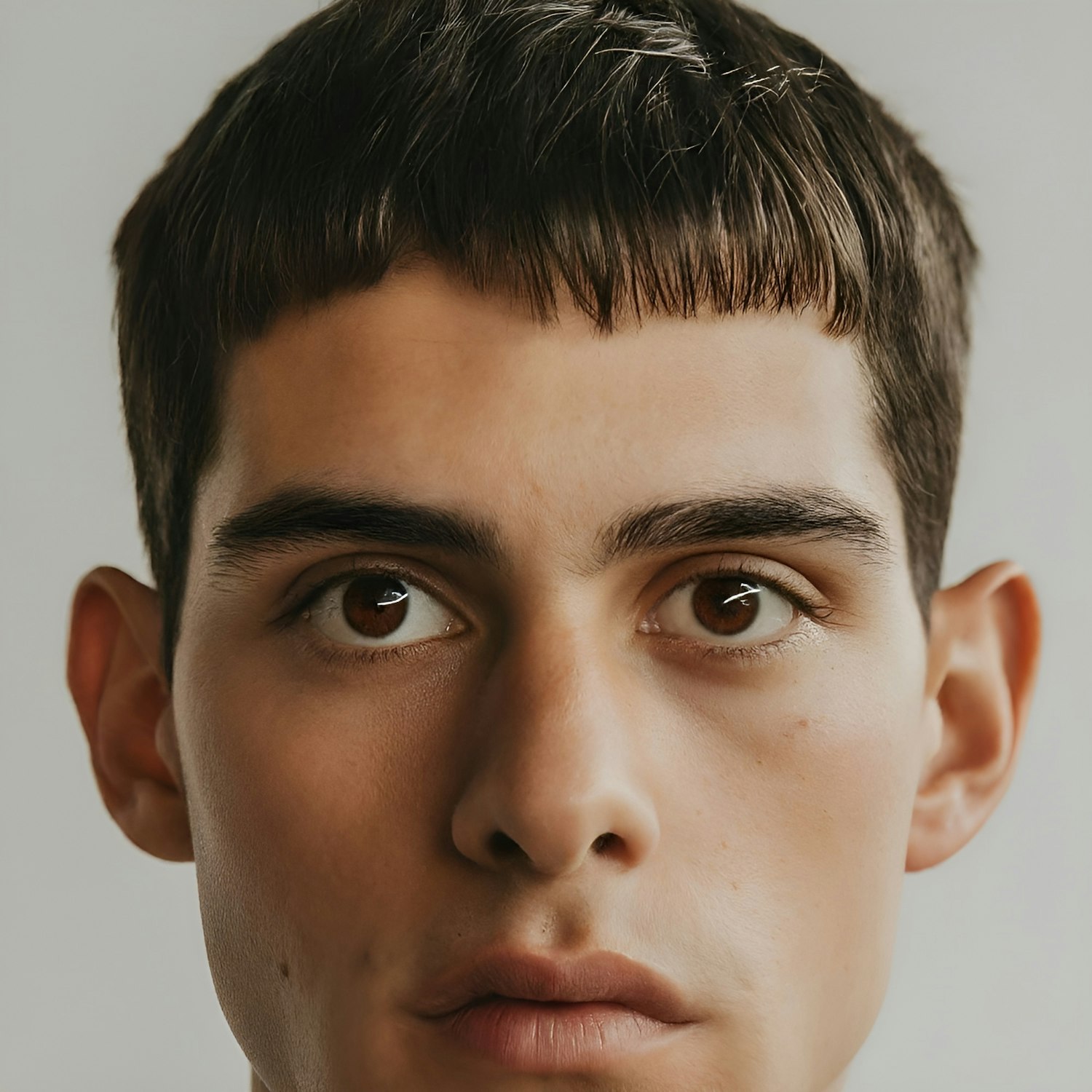 Close-up portrait of a young man with short dark hair and brown eyes, neutral expression, against a gray background.