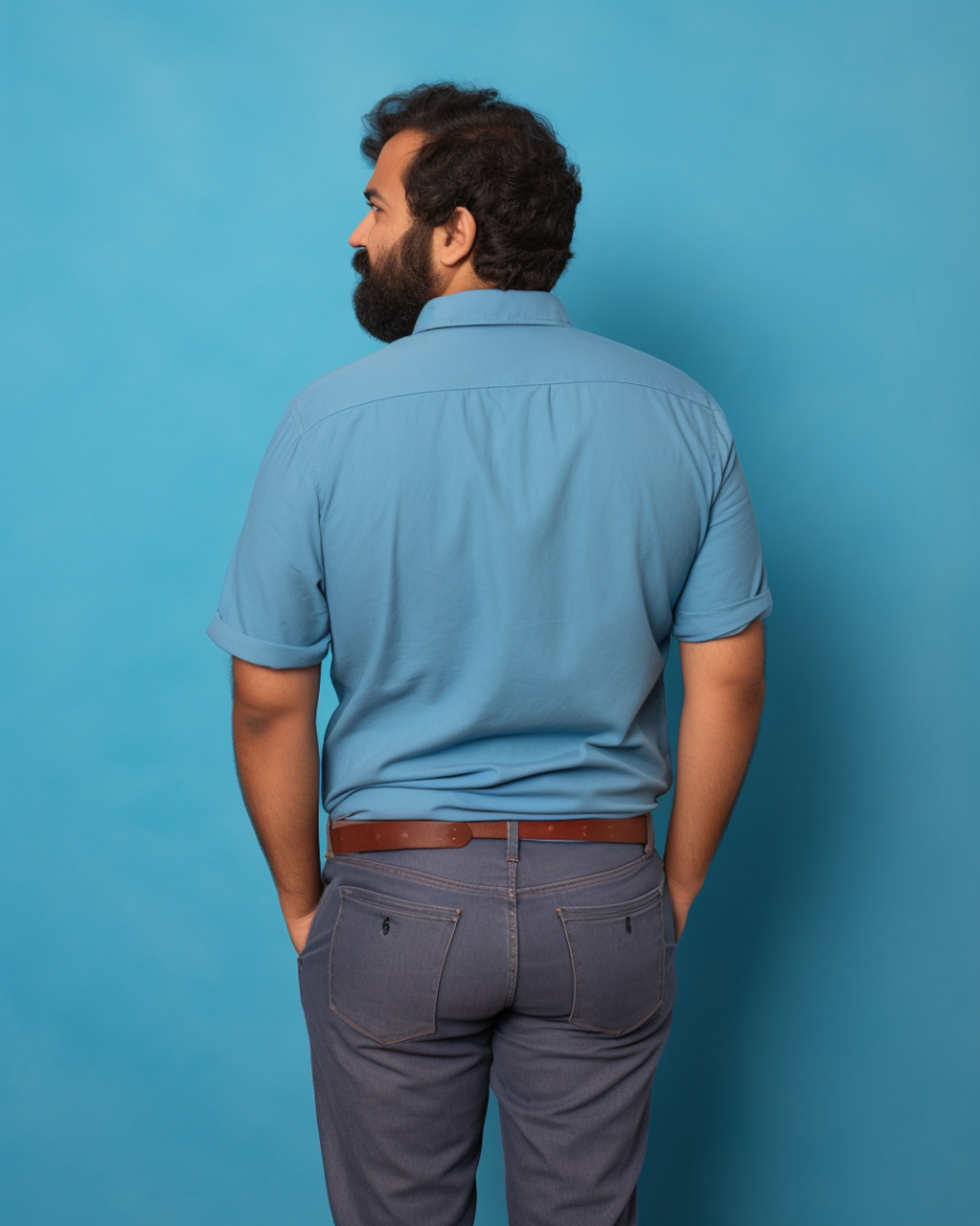 Man with beard in blue shirt and gray pants stands against a matching blue background, hands in pockets, looking to the side.