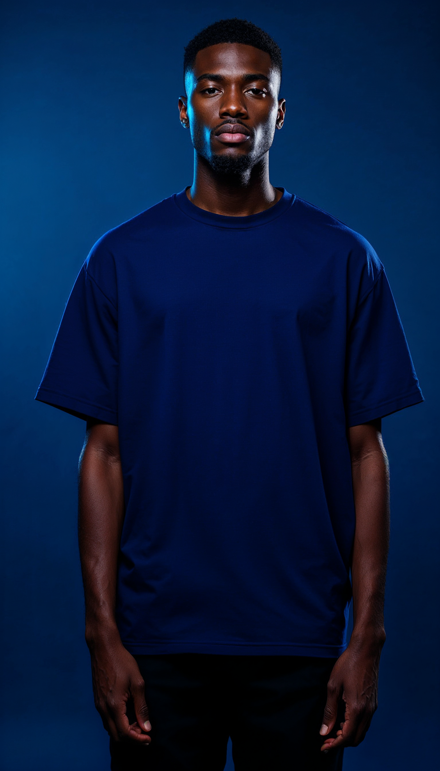 Portrait of a Black man in a dark blue t-shirt against a deep blue background, showcasing a neutral expression and short hair.