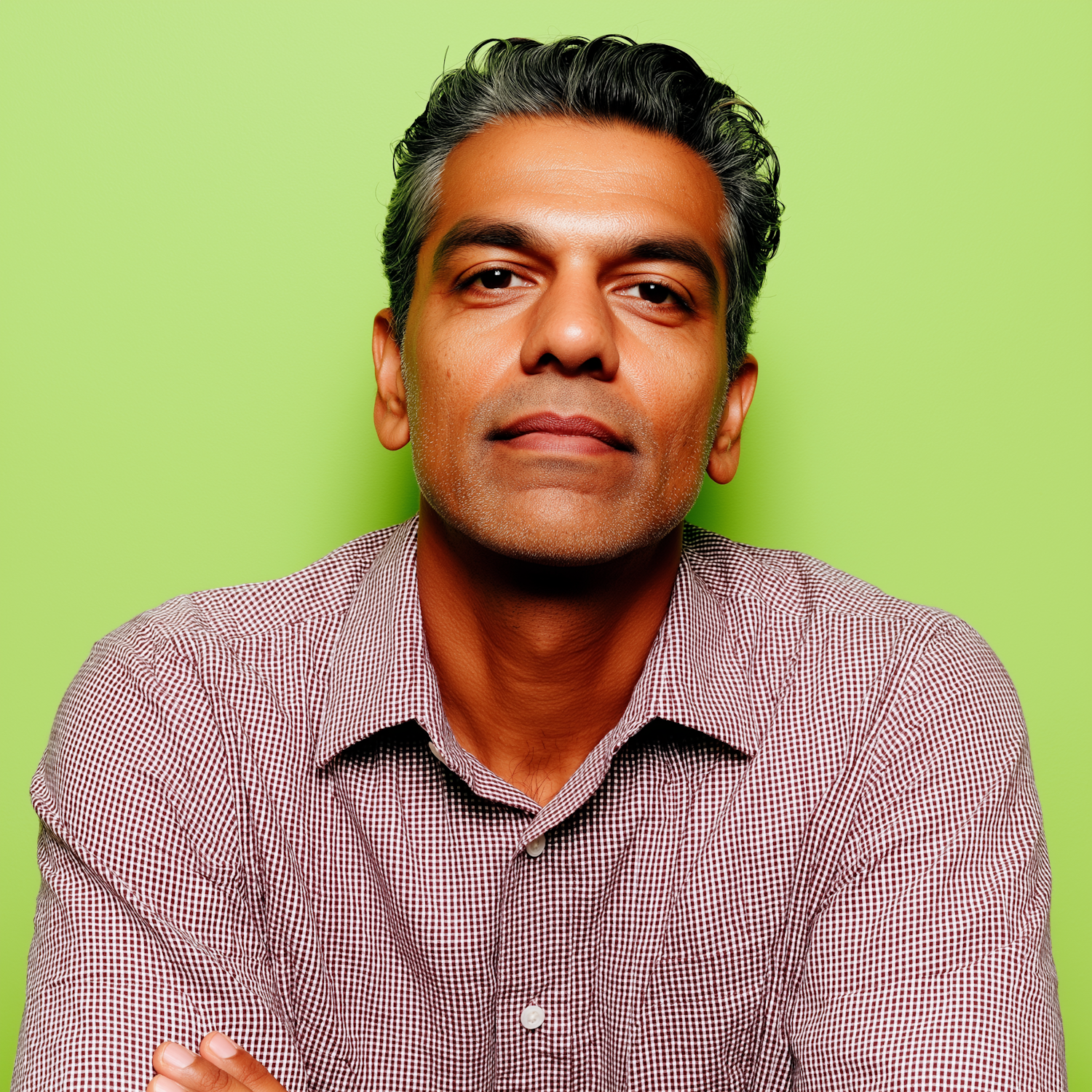 Man with short graying hair in a checkered shirt against a bright green background, looking directly at the camera.