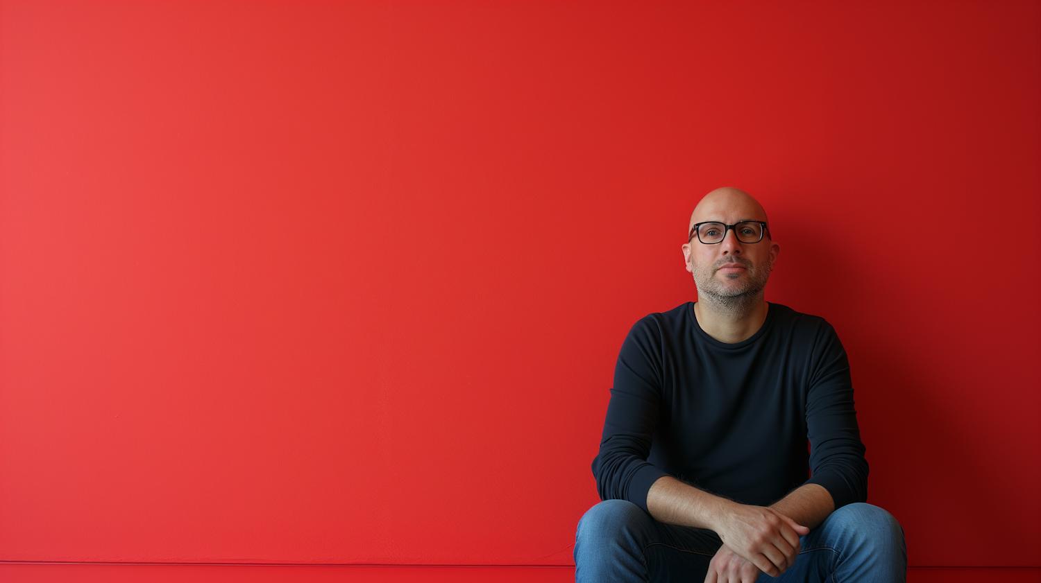 Bald man with glasses in dark shirt and jeans sits against a vibrant red wall, creating a striking minimalist composition.