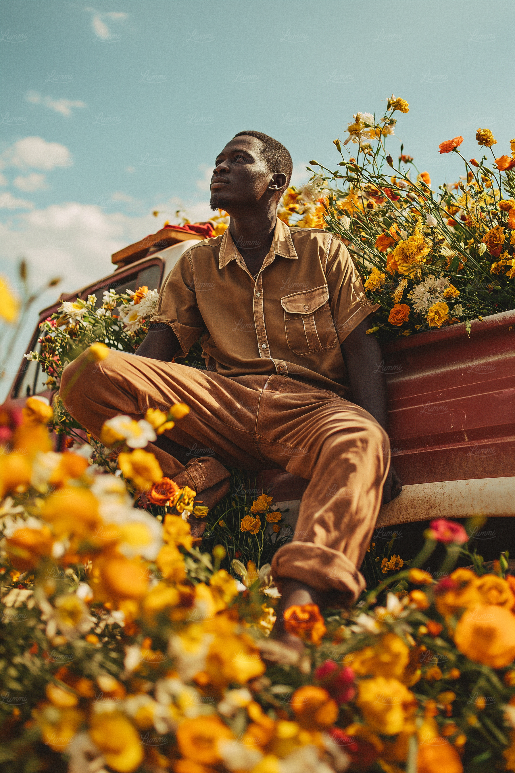 Young man in brown attire sits on a vehicle surrounded by vibrant flowers, gazing upwards against a clear blue sky.