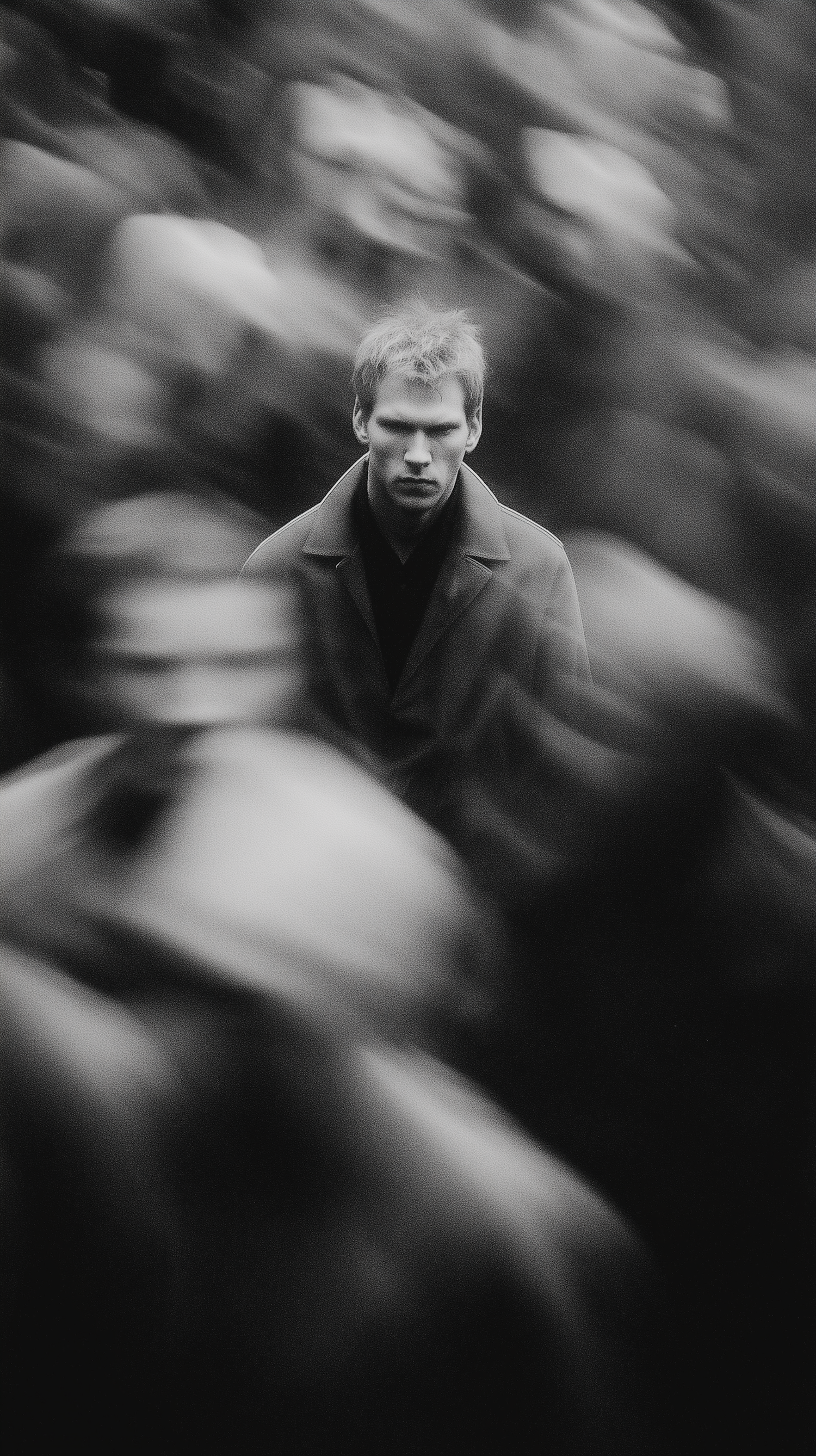 Grayscale image of a focused man in a dark coat surrounded by blurred figures, creating a dynamic interplay of stillness and motion.