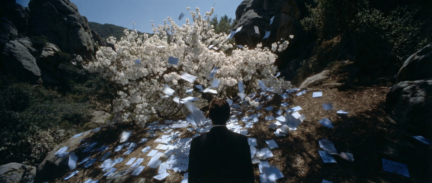 A man in a suit stands before a blooming white tree surrounded by floating papers, set in a rocky, green landscape.