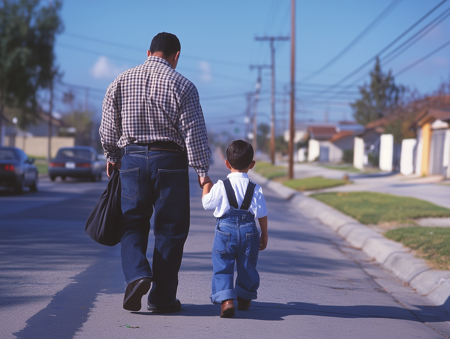 A man and boy walk hand in hand down a suburban street, wearing casual clothes. The scene is peaceful and sunny.
