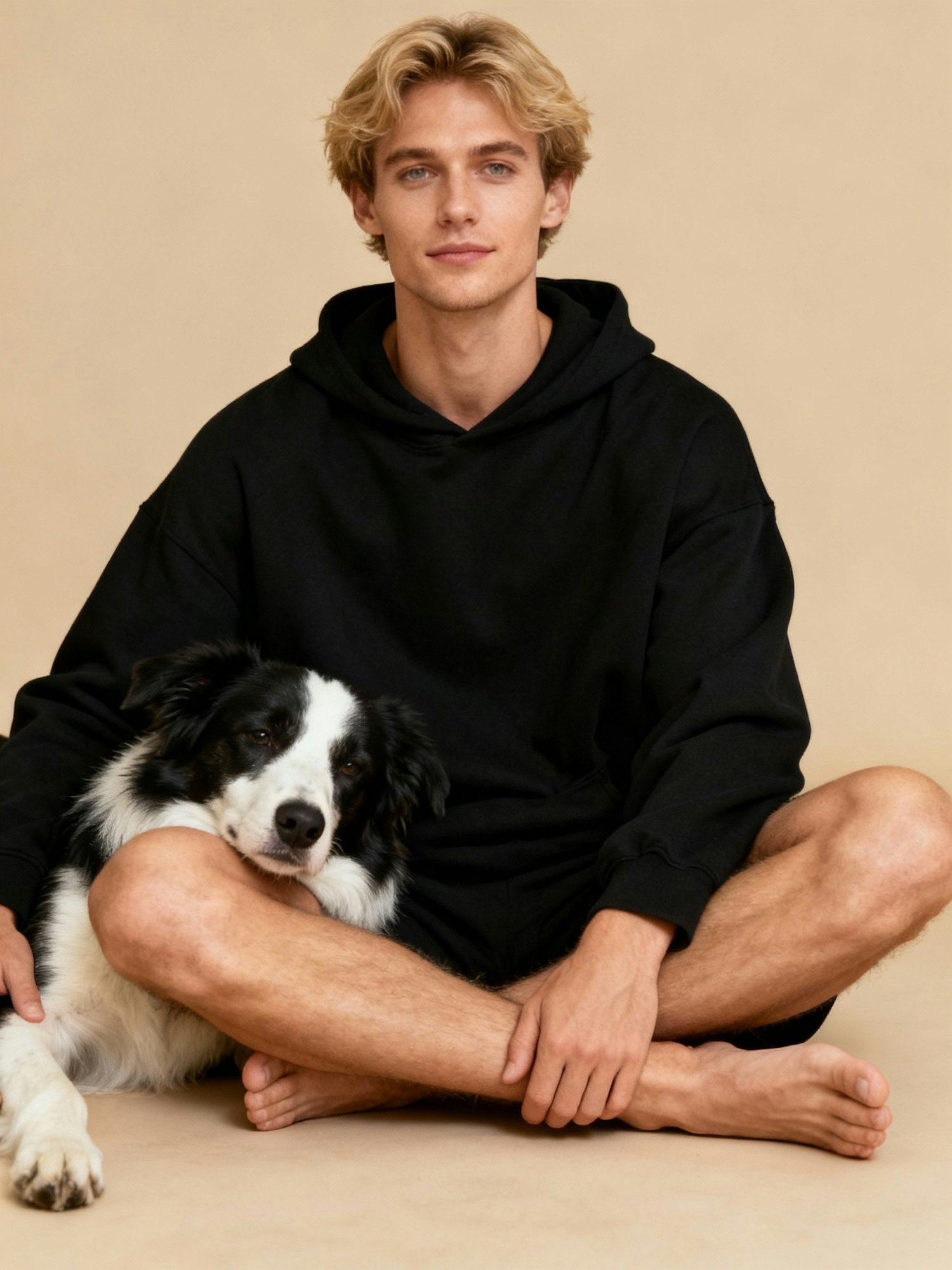 A young man in a black hoodie sits cross-legged with a black and white dog resting on his knee, creating a warm and relaxed scene.